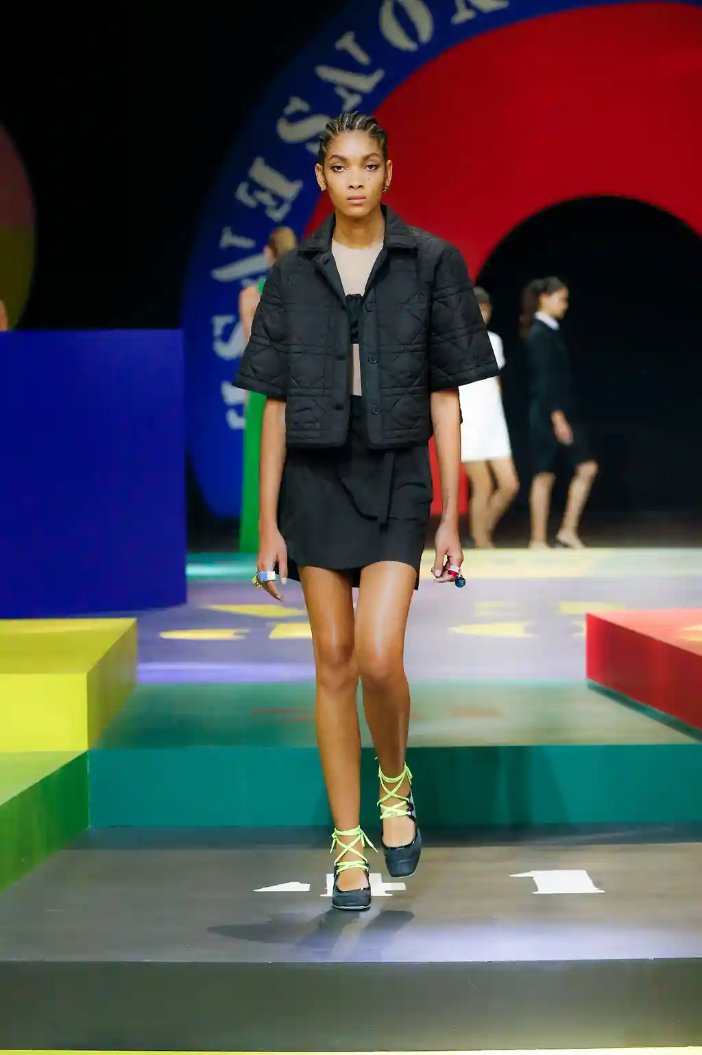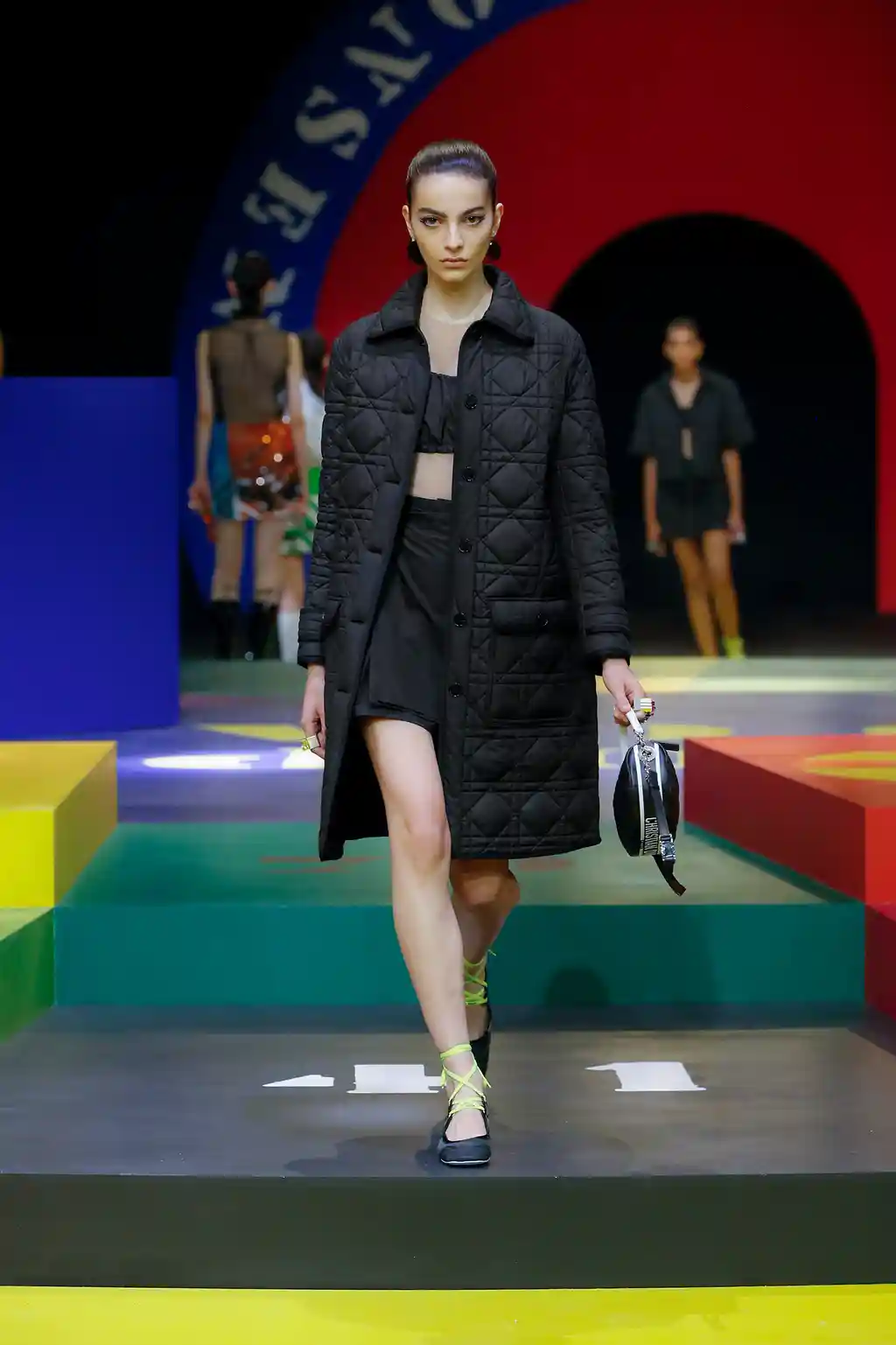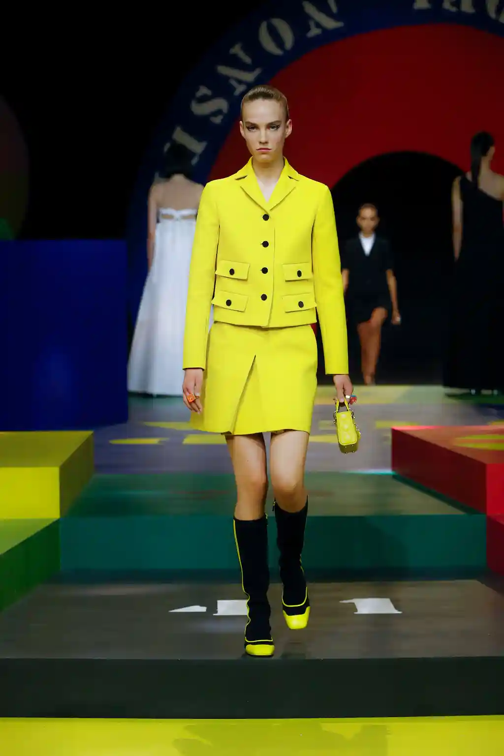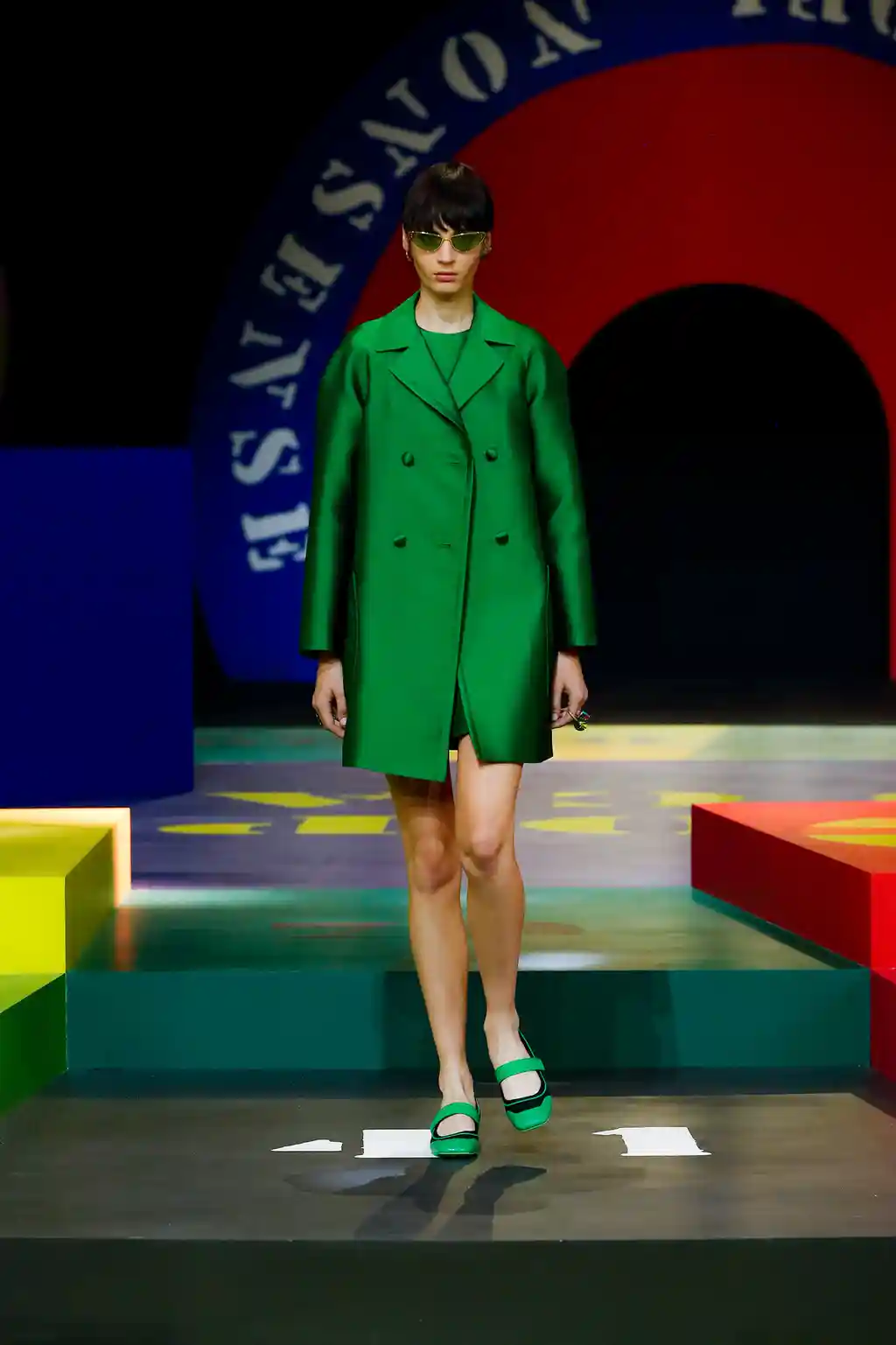 Yet yesterday’s collection felt like Chirui’s clearest message yet. There were no slogans, no questions and, indeed, no need. Opening Paris Fashion Week, Dior presented a show of mammoth scale. This season, as teased by an Instagram post or two, the creative director reached out to little-known veteran artist Anna Paparatti – a key figure in Rome’s 1960s art scene – to build a set that resembled a board game, geometric in its construction and painted in bright, bold hues. Opening with the shimmer of a disco ball and an Italian singer belting it out in the centre of the multicoloured stage, it felt like a suitably Roman tribute to optimism.