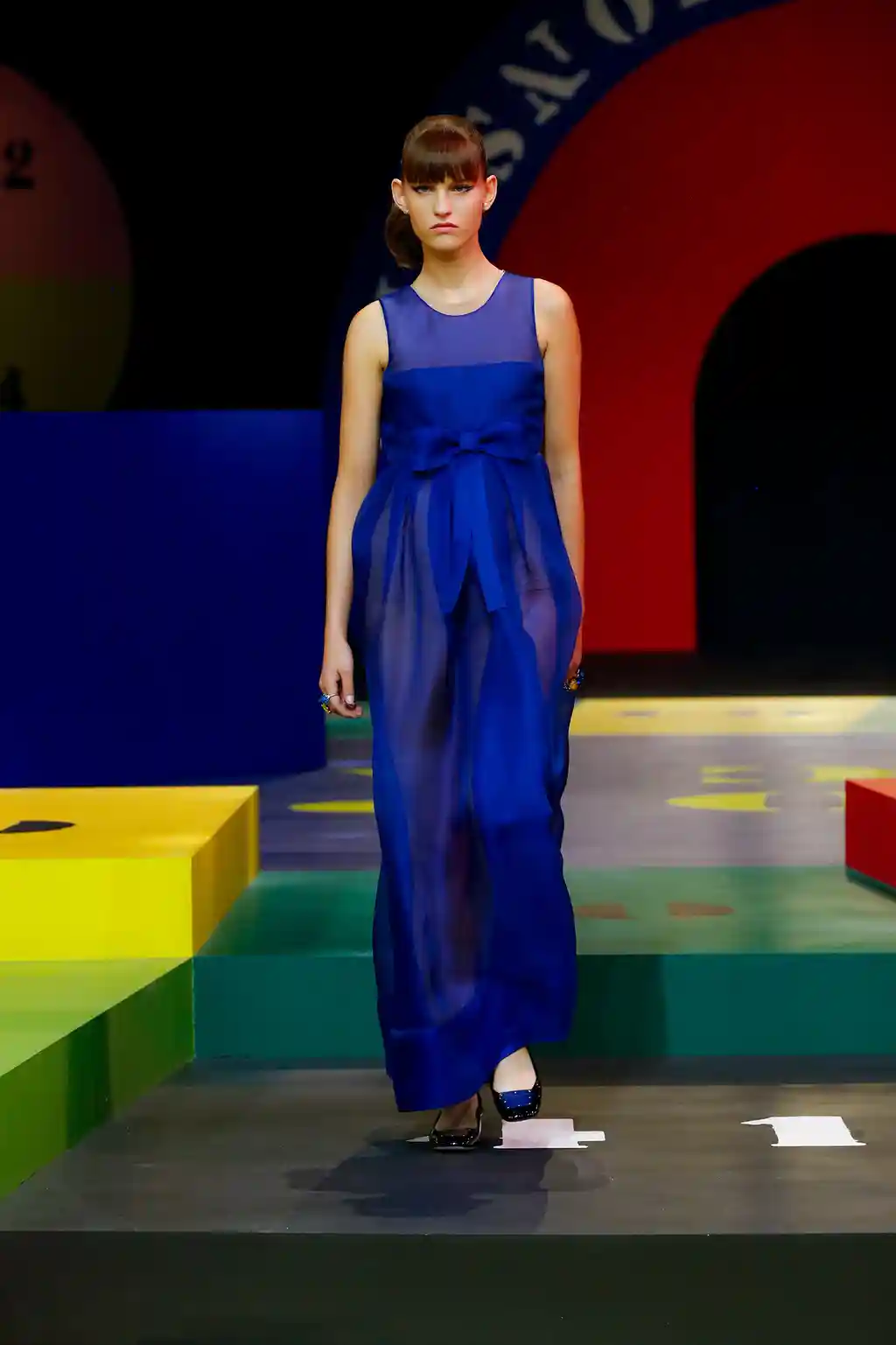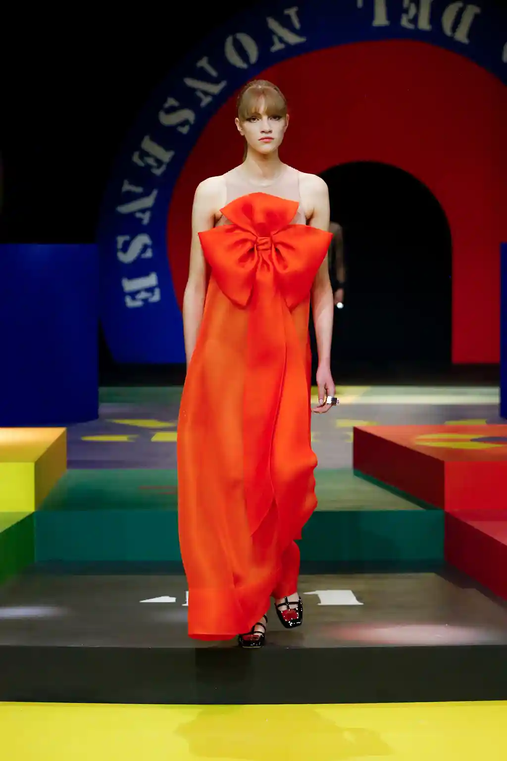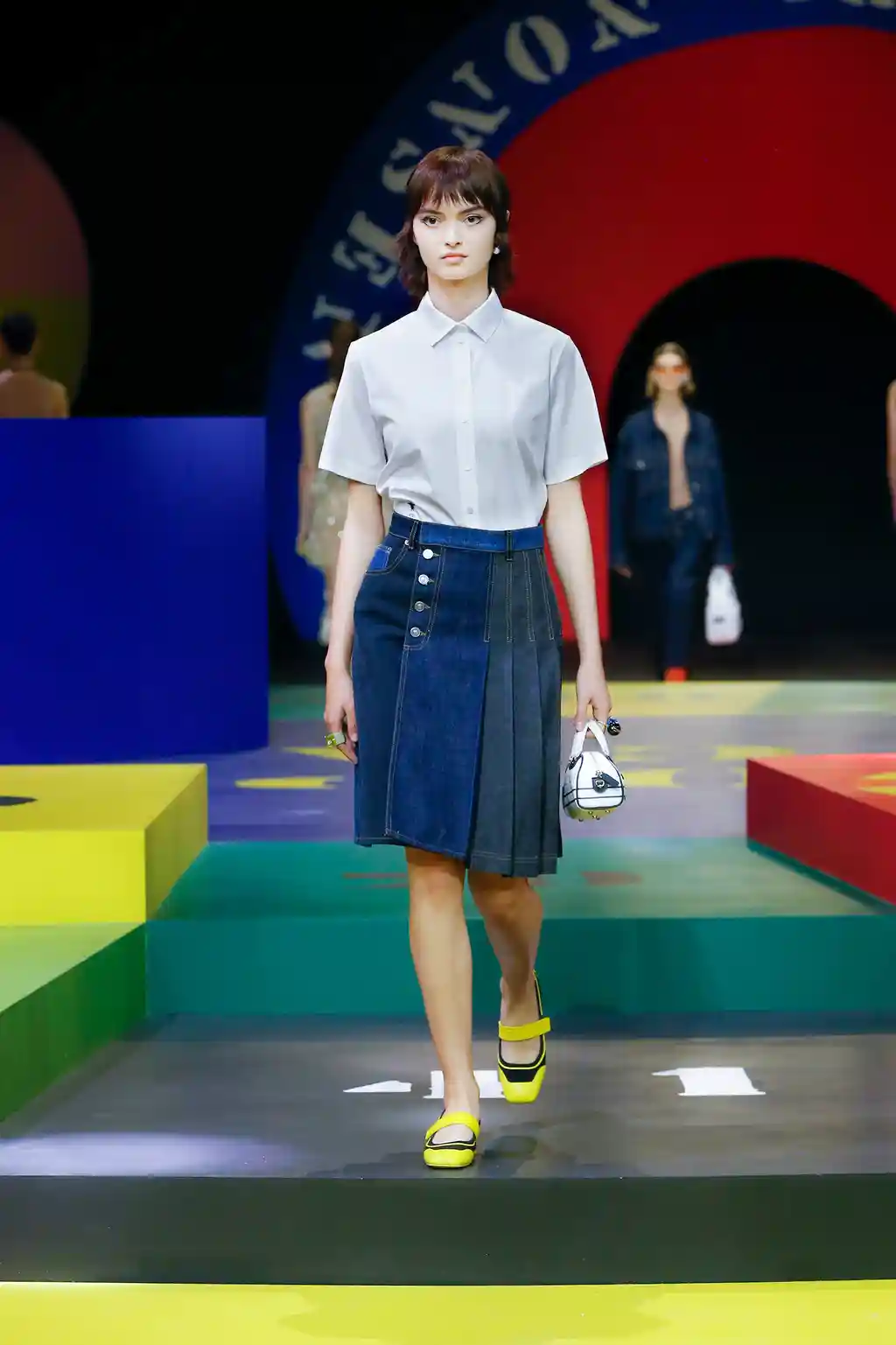 Yet yesterday’s collection felt like Chirui’s clearest message yet. There were no slogans, no questions and, indeed, no need. Opening Paris Fashion Week, Dior presented a show of mammoth scale. This season, as teased by an Instagram post or two, the creative director reached out to little-known veteran artist Anna Paparatti – a key figure in Rome’s 1960s art scene – to build a set that resembled a board game, geometric in its construction and painted in bright, bold hues. Opening with the shimmer of a disco ball and an Italian singer belting it out in the centre of the multicoloured stage, it felt like a suitably Roman tribute to optimism.