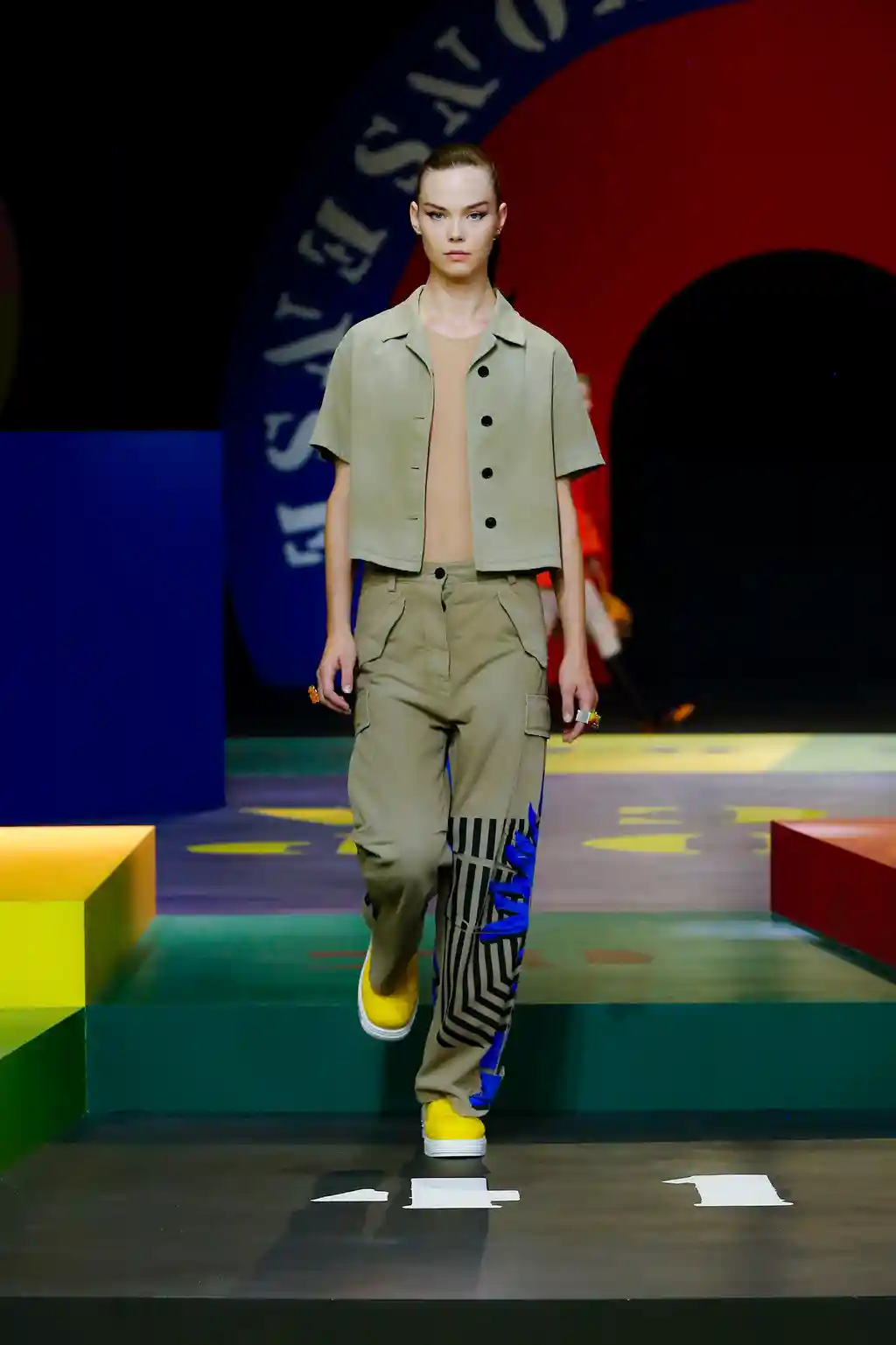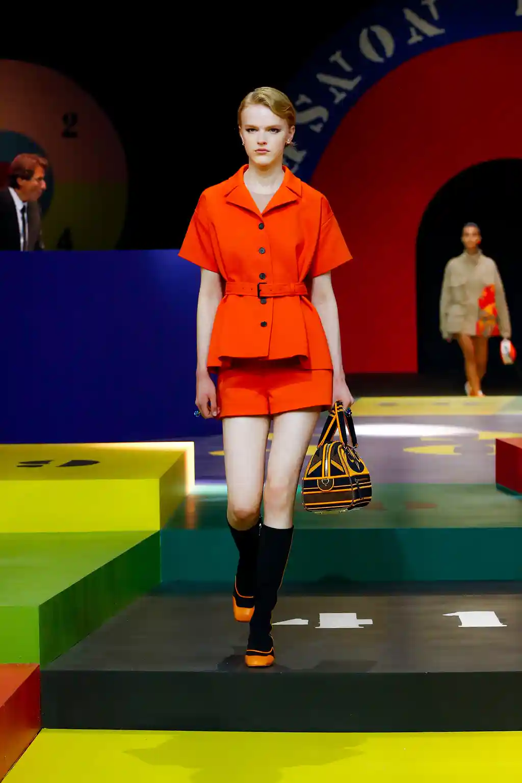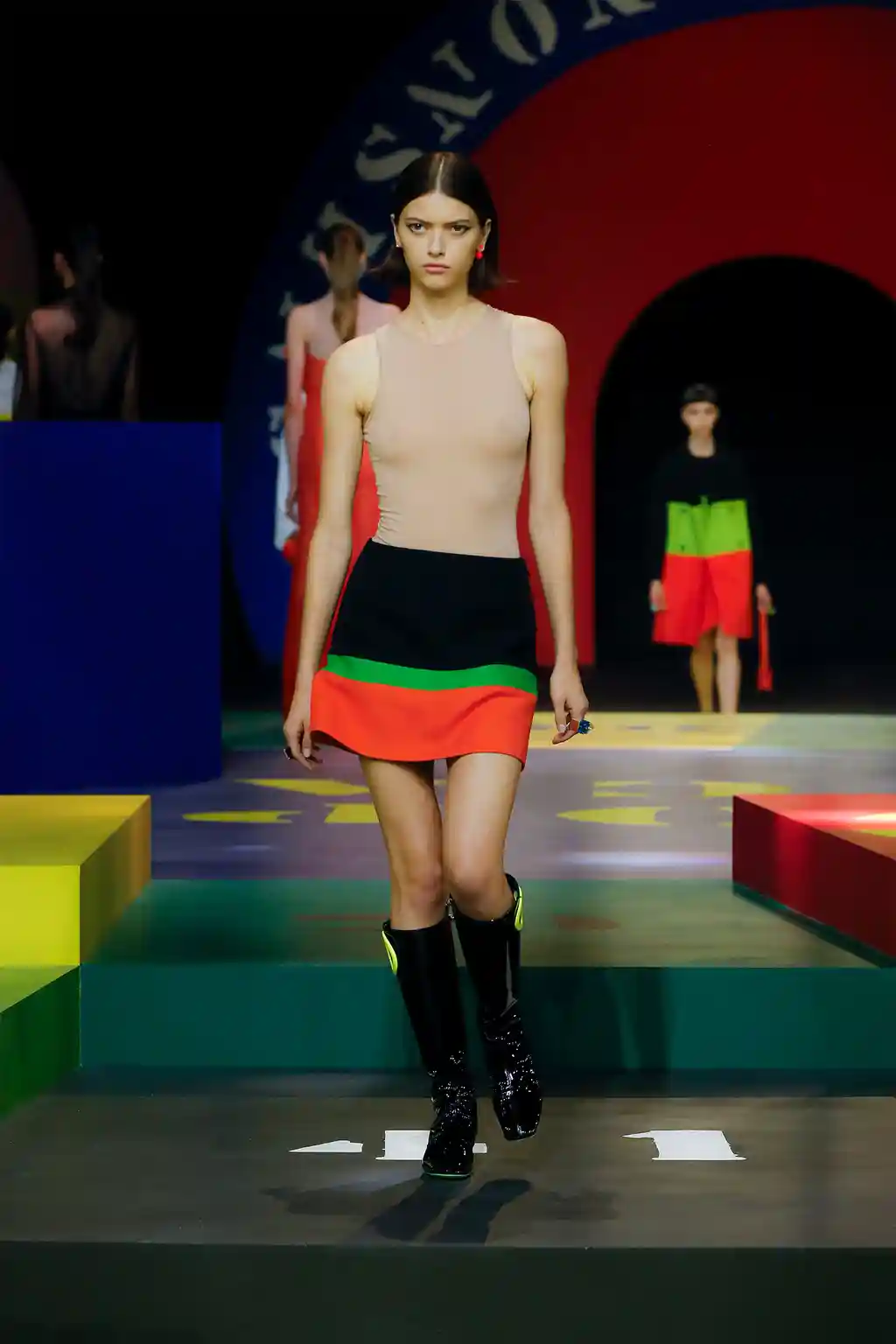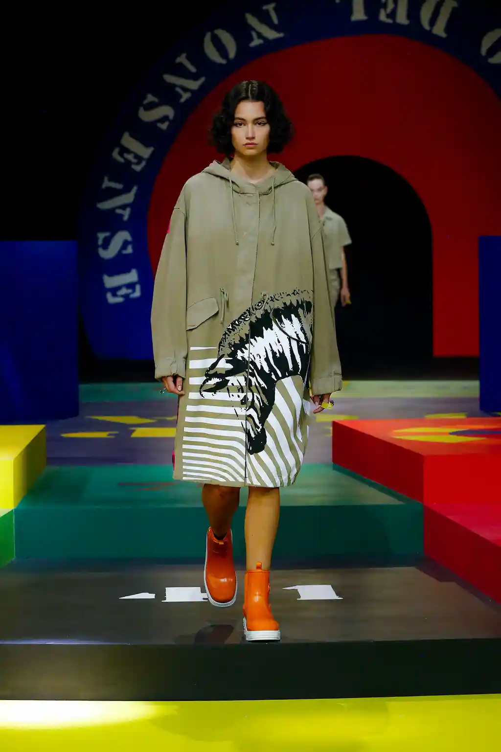 Yet yesterday’s collection felt like Chirui’s clearest message yet. There were no slogans, no questions and, indeed, no need. Opening Paris Fashion Week, Dior presented a show of mammoth scale. This season, as teased by an Instagram post or two, the creative director reached out to little-known veteran artist Anna Paparatti – a key figure in Rome’s 1960s art scene – to build a set that resembled a board game, geometric in its construction and painted in bright, bold hues. Opening with the shimmer of a disco ball and an Italian singer belting it out in the centre of the multicoloured stage, it felt like a suitably Roman tribute to optimism.