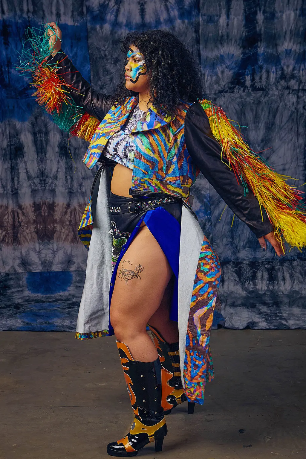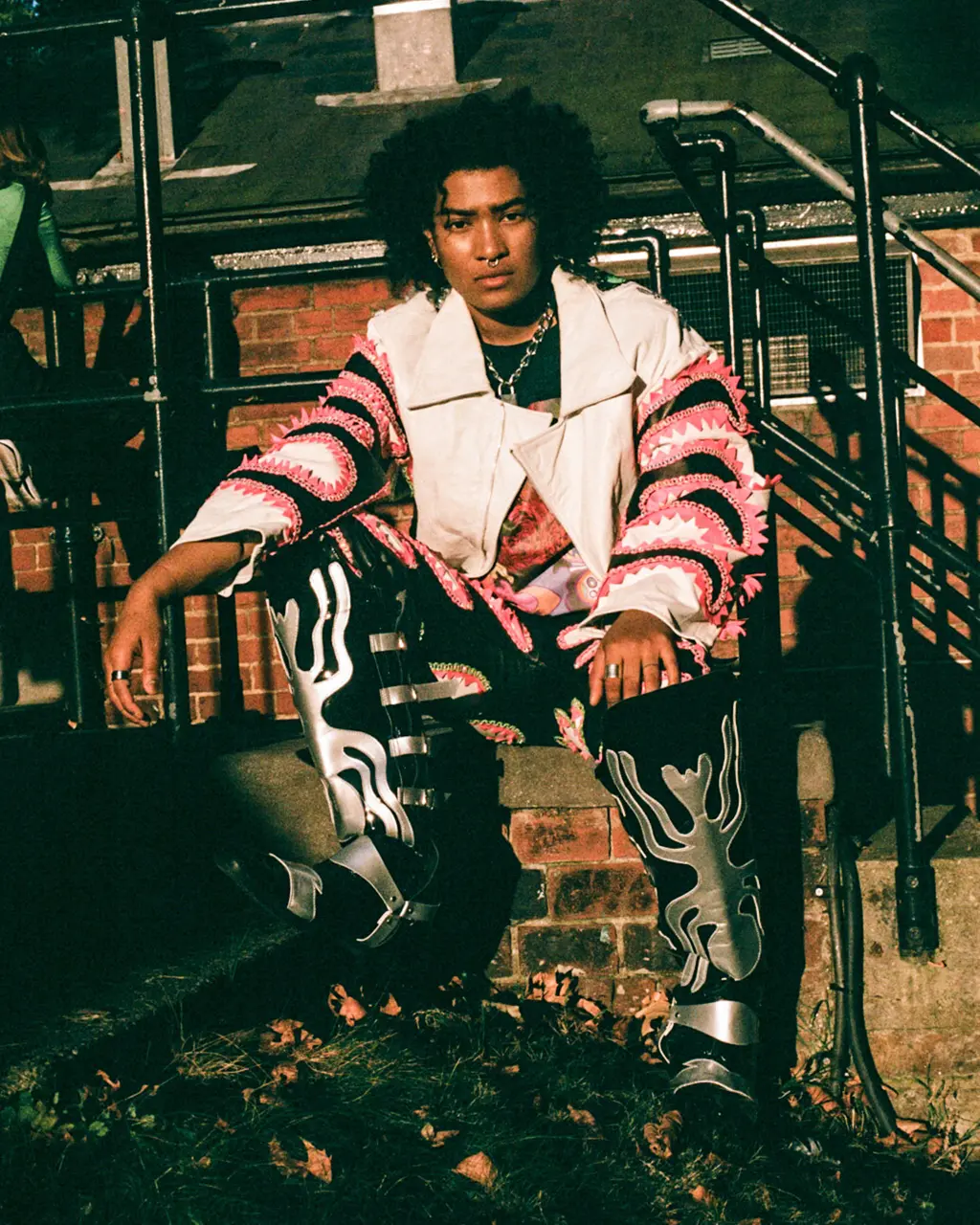A born and bred West Londoner, Mendoza’s garments are high-octane and brimming with originality. From knee high dancing boots emblazoned with silver spiders and spiked embellished trousers, to sherpa leather jackets customised with ultra-neon fringing and delicate embroidery, the designer marries technical prowess with an idiosyncratic, uncompromising vision.