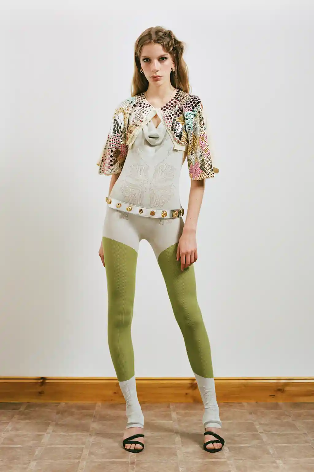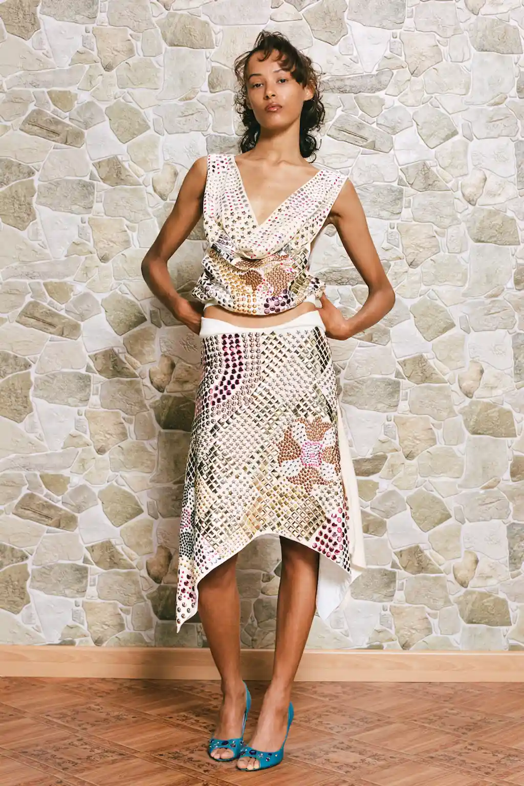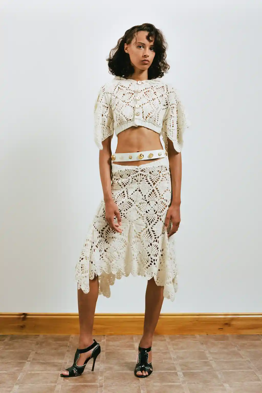 Zelentsova flicked through various ’80s knitting magazines for inspiration, taking in the chunky floral crochets and scallop edges of the “how-to” guides. But in her collection, those references are less frumpy, more frisky, in two-piece skirts and tops that just about cover the boobs. “I was also looking into a mix of casual and eveningwear jersey draping for this collection,” Zelentsova says. “Something you’d throw on for your evening stroll around the resort’s gardens.”