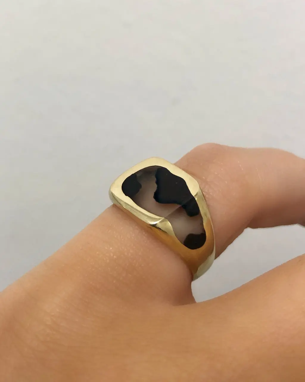 Mercer’s own process varies. “Resin is the worst thing to work with. You pour it as a liquid and then it has to set, but it’s so dependent on temperature. In the summer it can take a day to set, and in the winter that same thing could take a week.” Heat accelerates curing, the hardening of the material. “If you mix a little bit wrong it won’t set at all,” she continues. Mostly, Mercer has been experimenting with casting colour and objects in the tiny resin patches that embellish each ring. One of them was weed: “You can cast anything in resin…” she joked on Instagram, but that particular effect has been hard to recreate.
