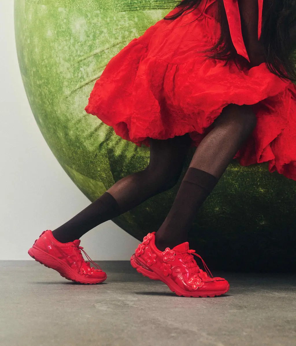 When floral-laden Asics in muddy brown and black were sent bounding down the AW24 runway back in February, they were the topic of much discussion as editors filed out of the show. When we weren’t lusting after Cecilie’s voluminous metallic dresses, laser-cut trenches and delicate, wispy dresses, it was hard not to turn our attention to the matching, flower-laden Asics. Well, today is the day you can finally get your hands on a pair as London’s Dover Street Market is stocking both colourways, including a (not so secret) scarlet pair that are fast becoming a fashion favourite.