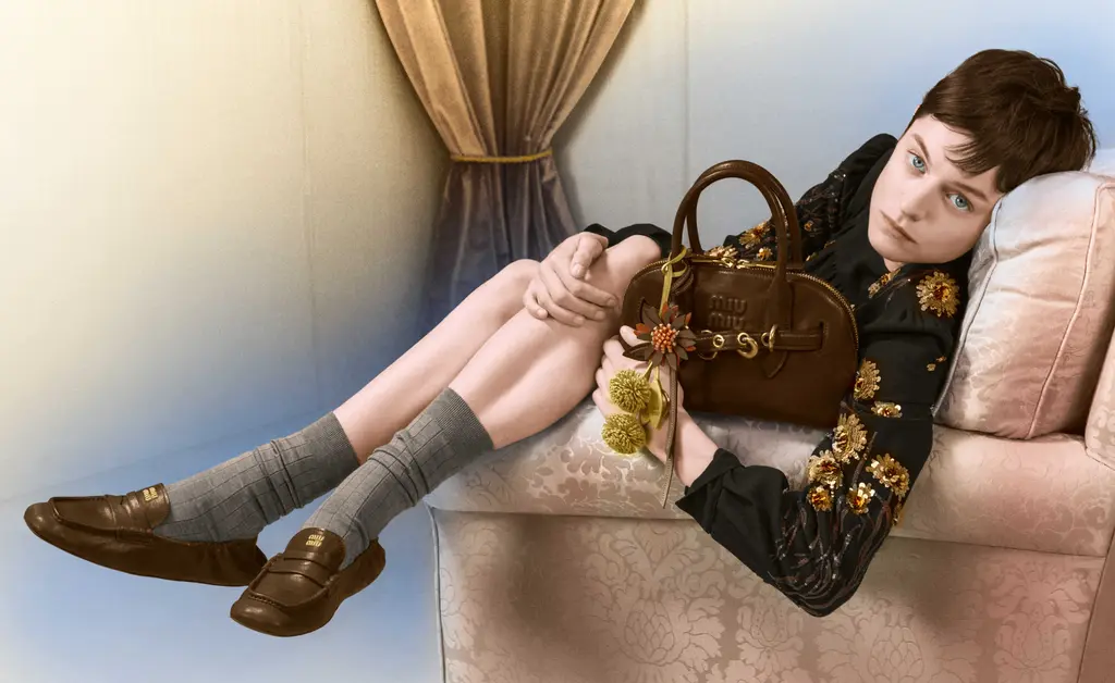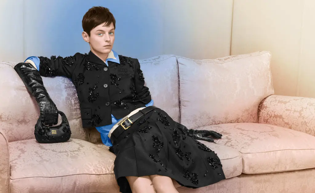 Underneath a warming glow, photographed by Lengua, the actor looks as though butter wouldn’t melt. Sporting a variety of ensembles with twinkling adornments, they pose against a bunch of paisley sofas – and atop one grand piano – in contrasting Miu Miu looks, from a collegiate bomber jacket with knitted sleeves to an inky floral applique on a relaxed tailored skirt suit.