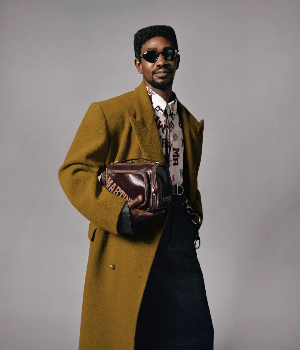Simz’s presence, meanwhile, is unmistakable. Her intense gaze? On point. Her ‘fit? Immaculate. Sat on a chair in a room with a whirlpool carpet, the Gorilla rapper looks divine in a duck-egg blue skirt, clutching a black nappa leather bag with gold hardware, patent gloves, and a cardi your nan would certainly try to nab off your back.