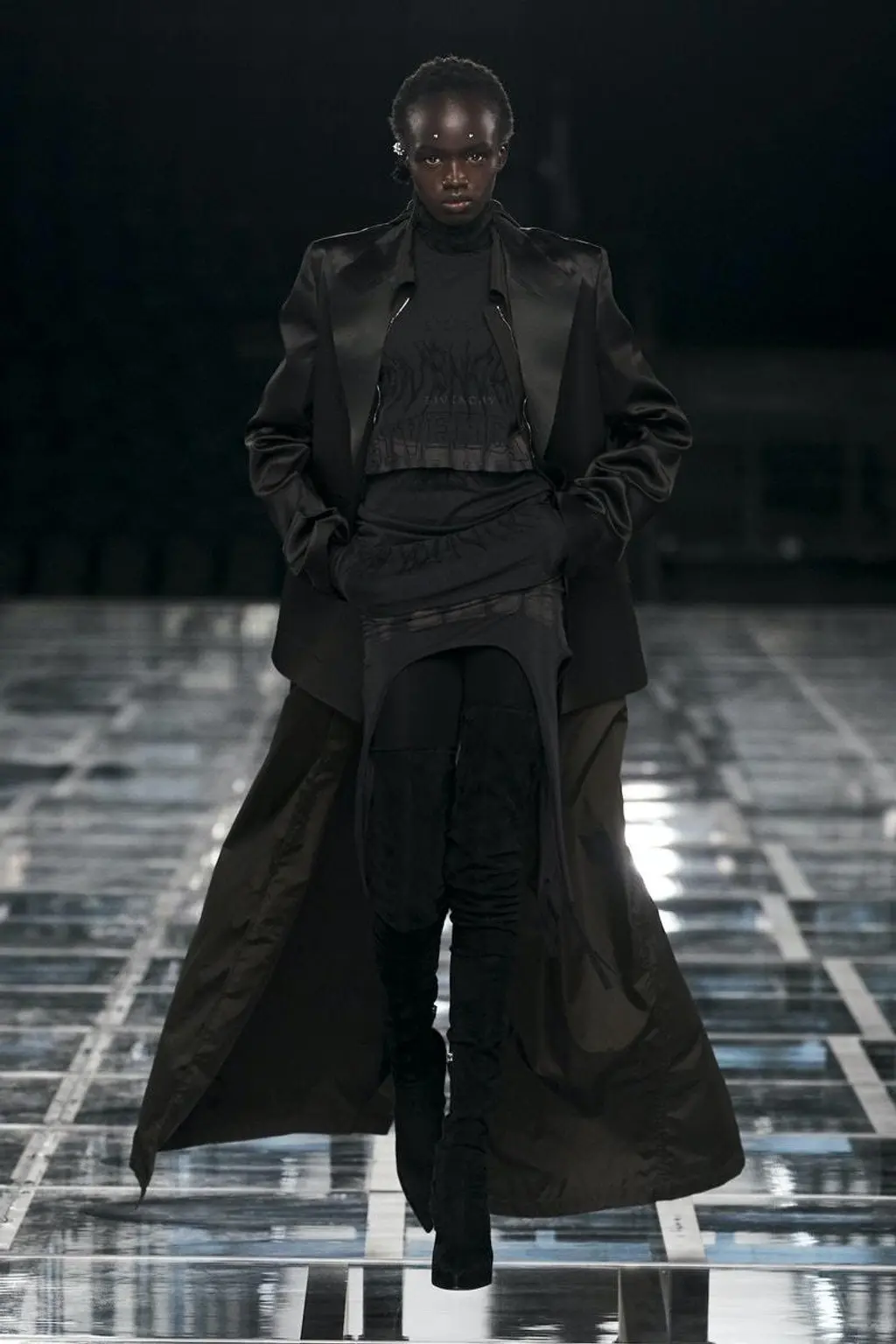 Elsewhere in the new collections, Givenchy’s models were made for battle, forming a cult in layered black jumpers, leather trousers and boxy black t‑shirts with gothic letters stretched across – and the occasional balaclava. And Rick Owens’ show – where he spoke of how “during times of heartbreak, beauty can be one of the ways to maintain faith” in the accompanying show notes – the often anarchic edge was replaced with a heady romance. While he presented zipped-up hoods and lamp helmets for the house’s men’s show in January, the womenswear was almost romantic in comparison, with angelic figures in intricately detailed gowns, capes and the ultimate warrior footwear: the stacked, shinpad-like Kiss boot, stretched to the thigh.