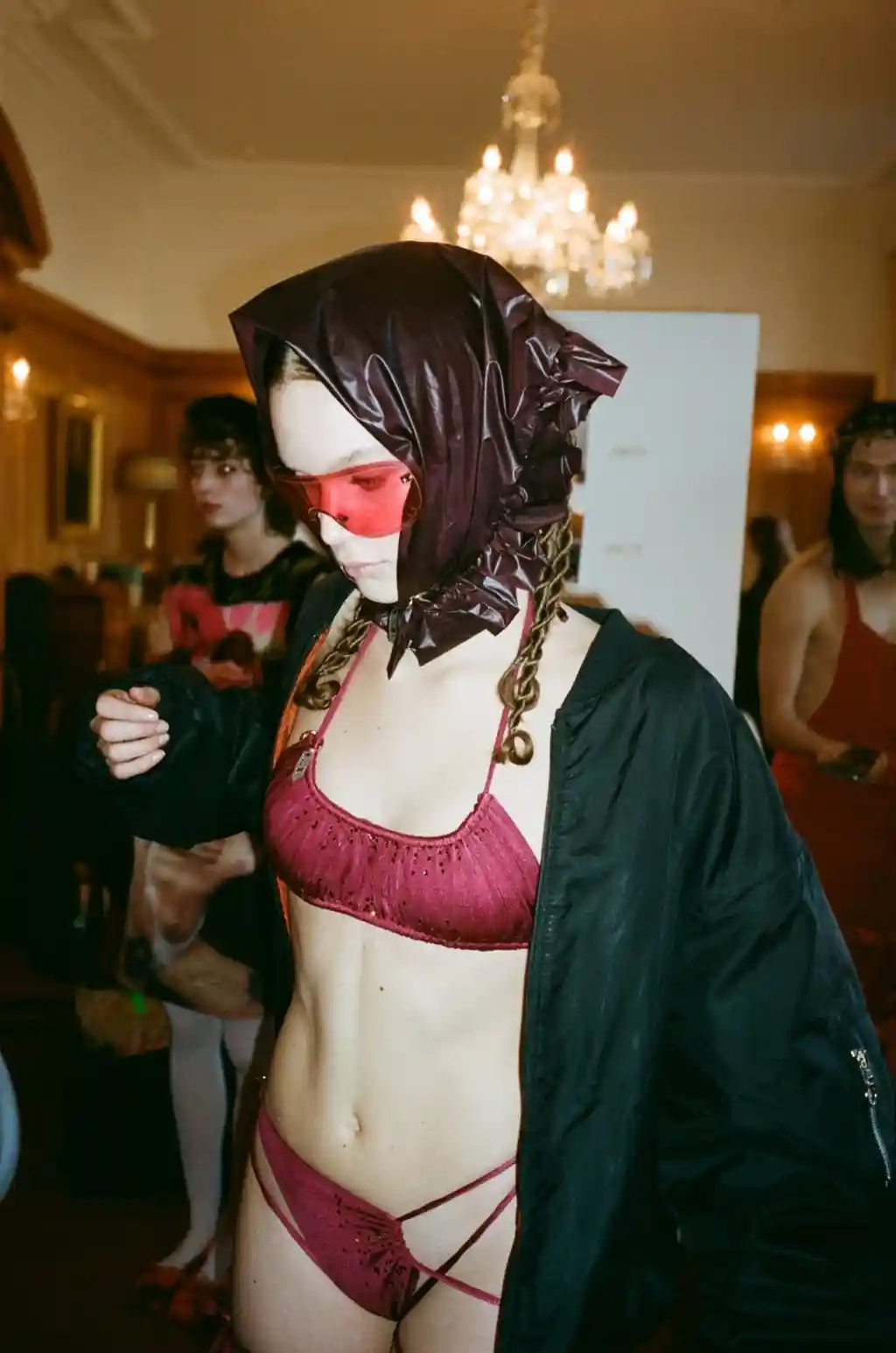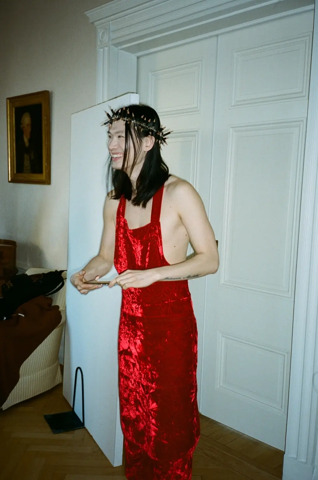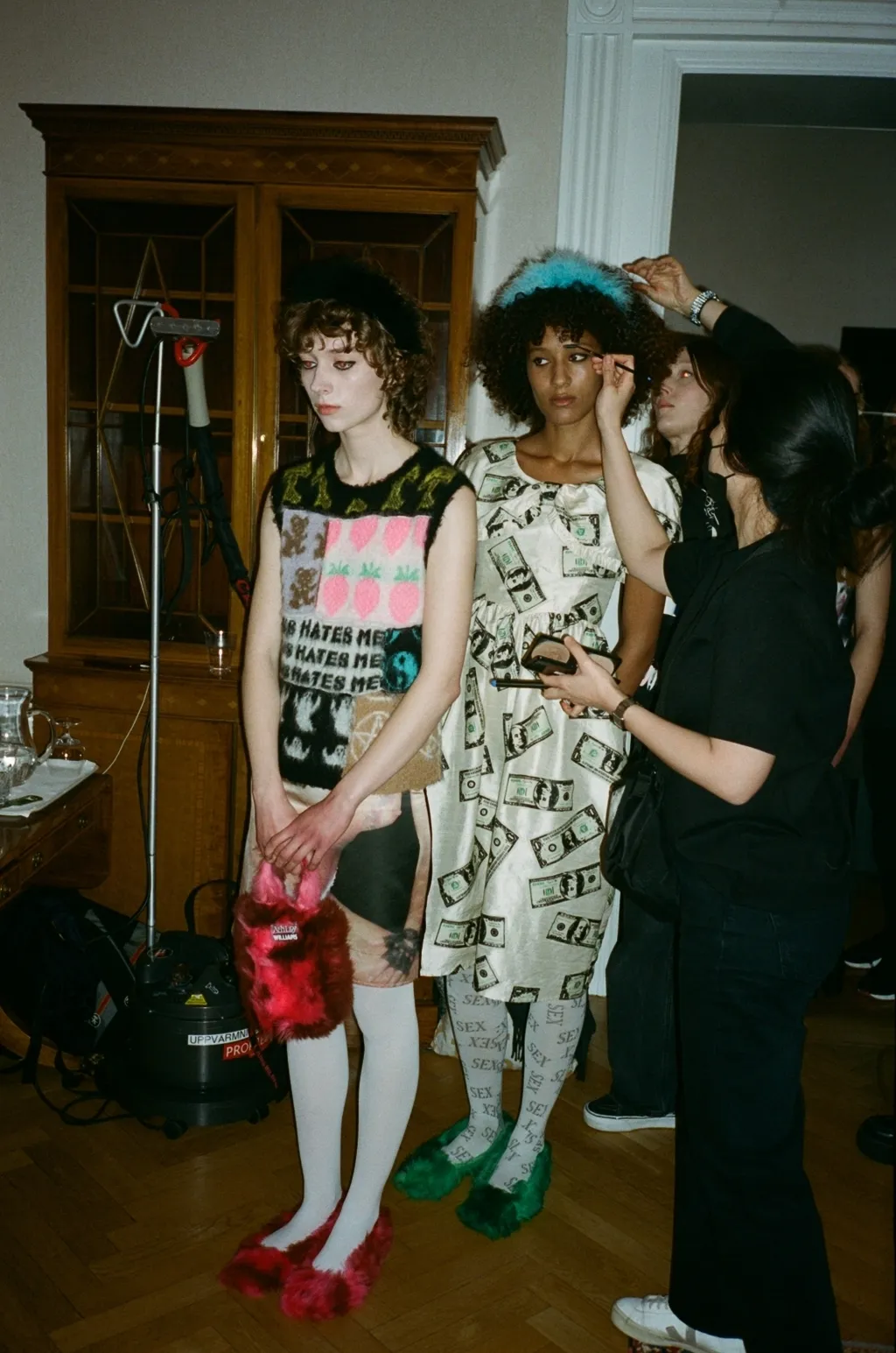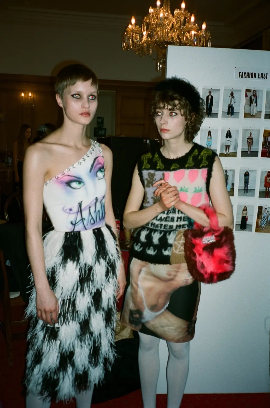 “As it was only five looks each, we got to pick their ‘greatest hits’,” Raph says. And so on show to a lively audience were Ashley’s dalmatians and pentagram patchwork vests, Per’s baggy hot boy jeans and crushed velvet pinnies, HRH’s ultra-sexy swimwear and Goom’s subversive take on menswear, all lycra and puffy mini skirts. It was basically a presentation of the bonkers and brilliant stuff that has kept the Fashion East flame alive for over 20 years.