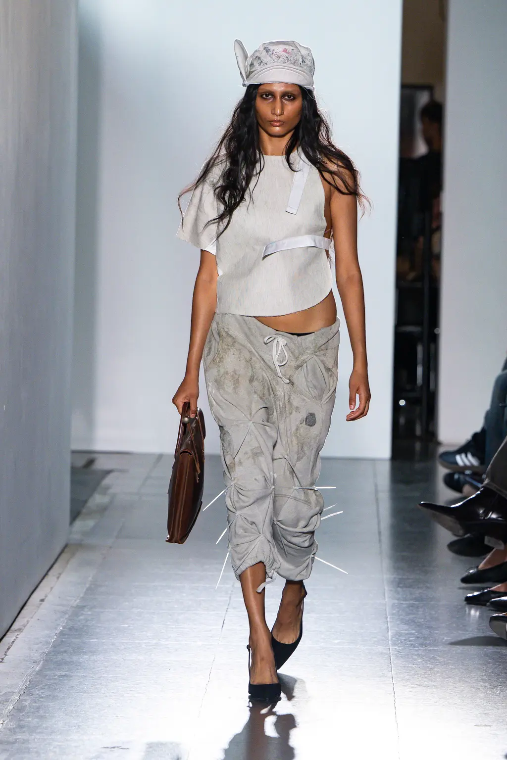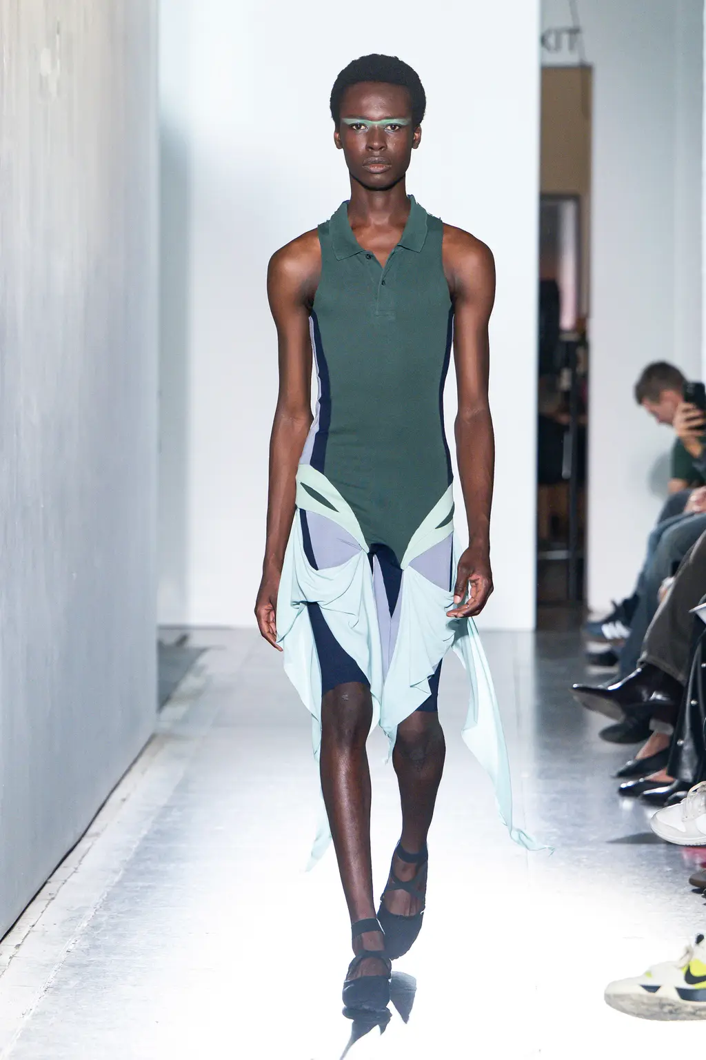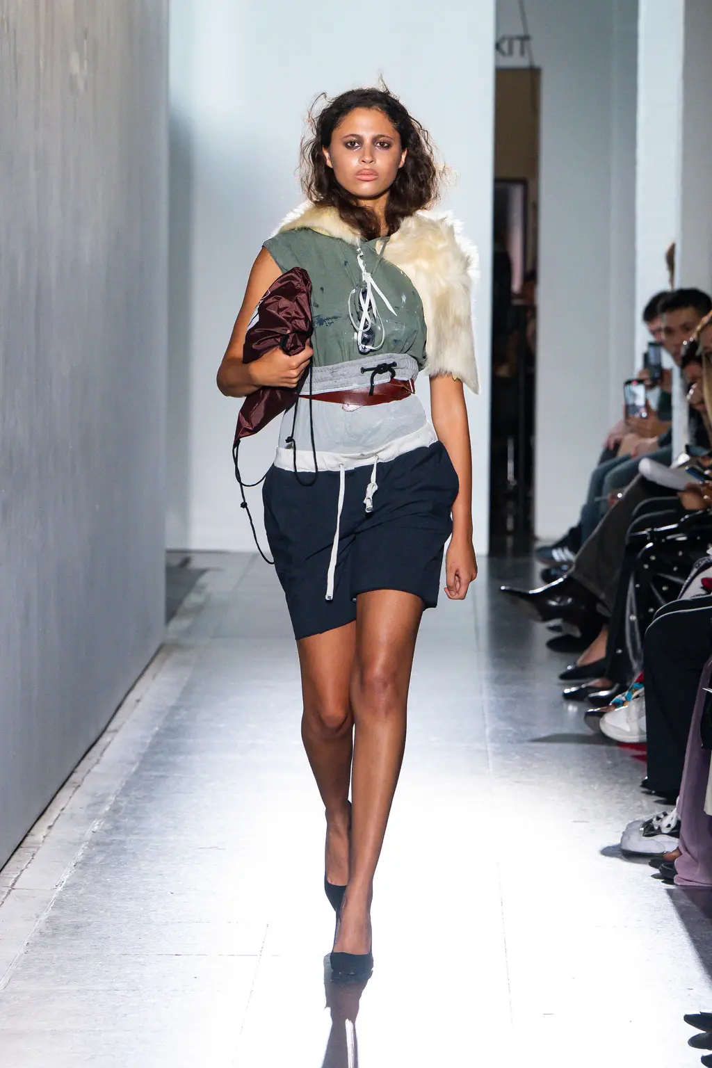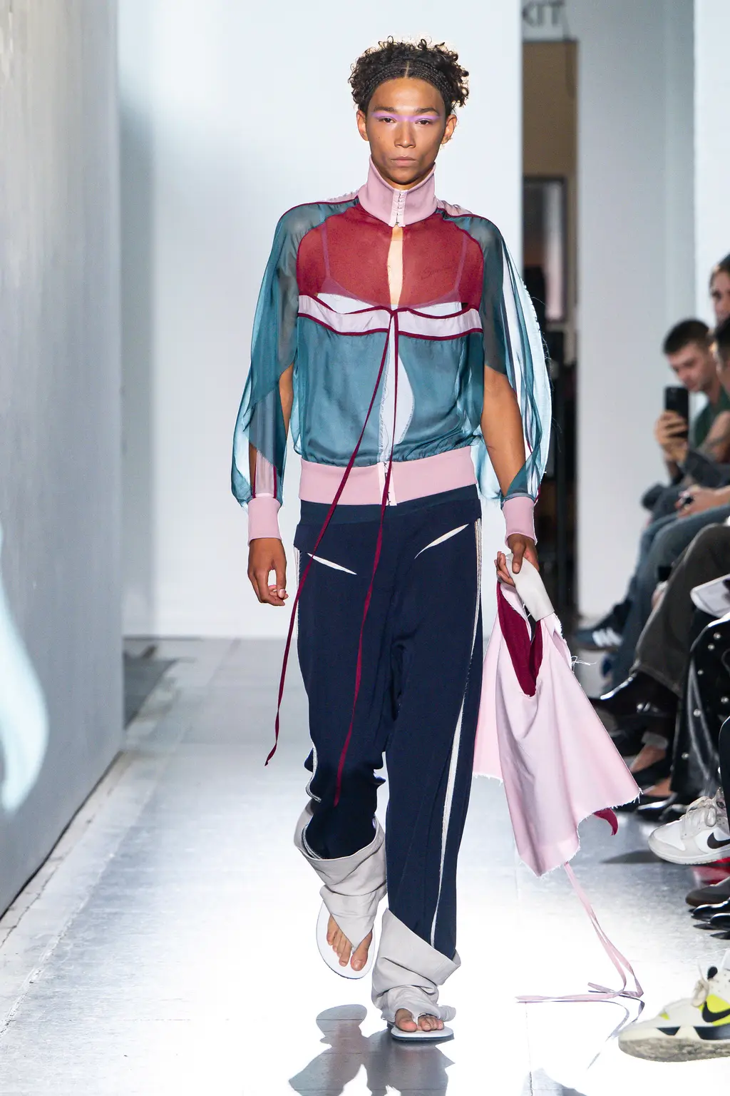 For Nuba – headed up by CSM-educated Cameron Williams – this was the last of three collections under Fashion East, and he continued a draped yet calculated approach to tailoring rooted in Afro-Caribbean diaspora. LFW newcomer Jacek Gleba took inspiration from the diaries of ballerina Vaslav Nijinsky, creating delicate, intentionally unfinished silks. For fellow newbie, Louis Mayhew, formerly a construction worker by day, this season included a heavy-duty, trade-inspired capsule and it marked his introduction to womenswear.