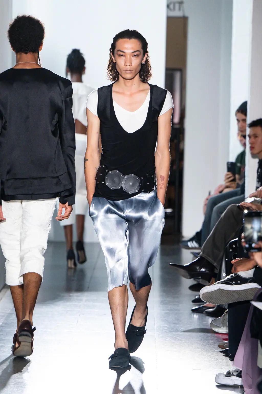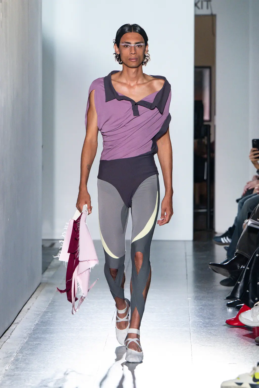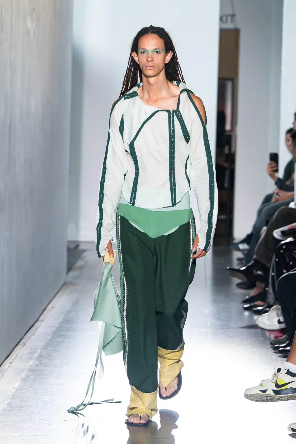 For Nuba – headed up by CSM-educated Cameron Williams – this was the last of three collections under Fashion East, and he continued a draped yet calculated approach to tailoring rooted in Afro-Caribbean diaspora. LFW newcomer Jacek Gleba took inspiration from the diaries of ballerina Vaslav Nijinsky, creating delicate, intentionally unfinished silks. For fellow newbie, Louis Mayhew, formerly a construction worker by day, this season included a heavy-duty, trade-inspired capsule and it marked his introduction to womenswear.