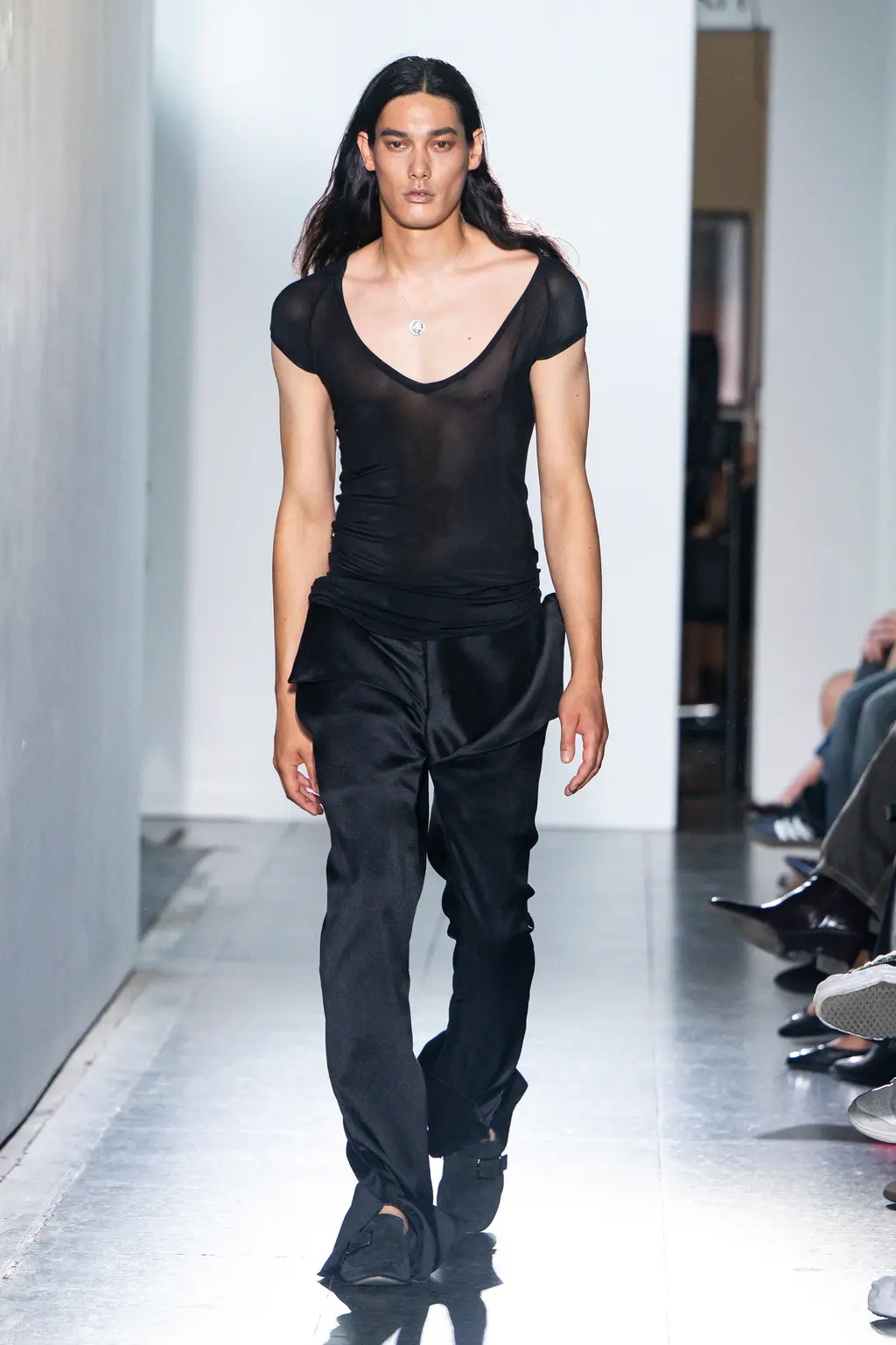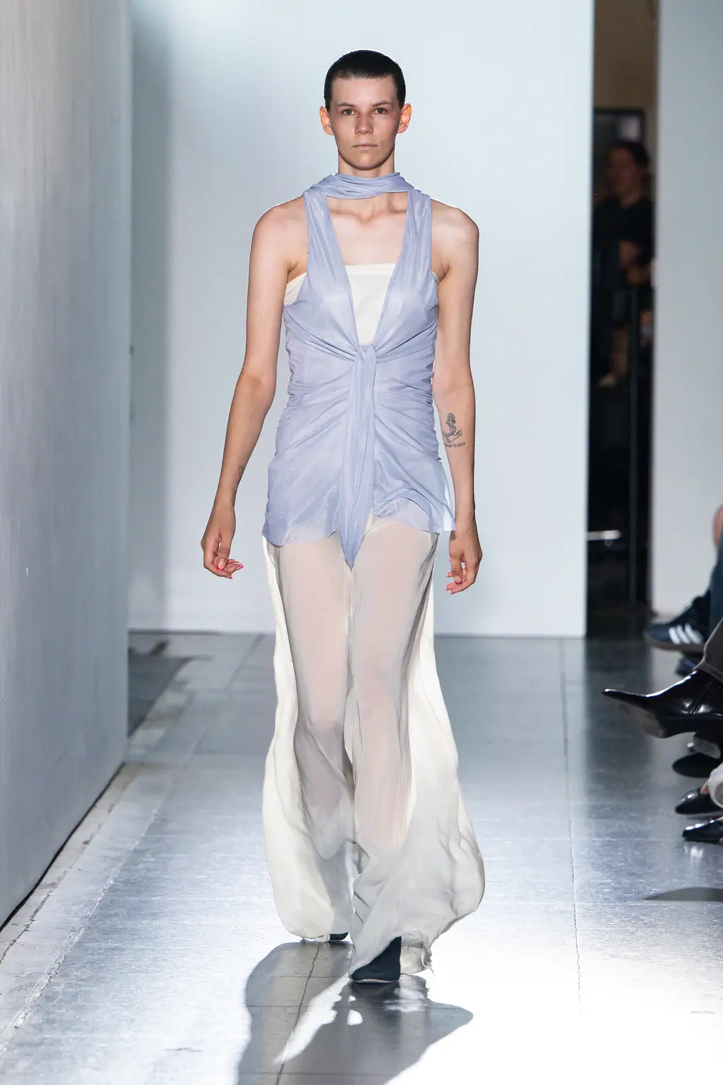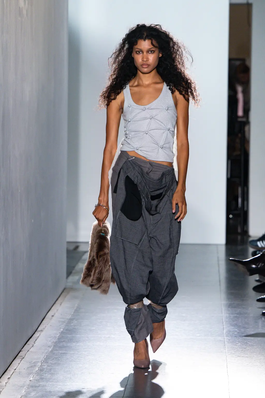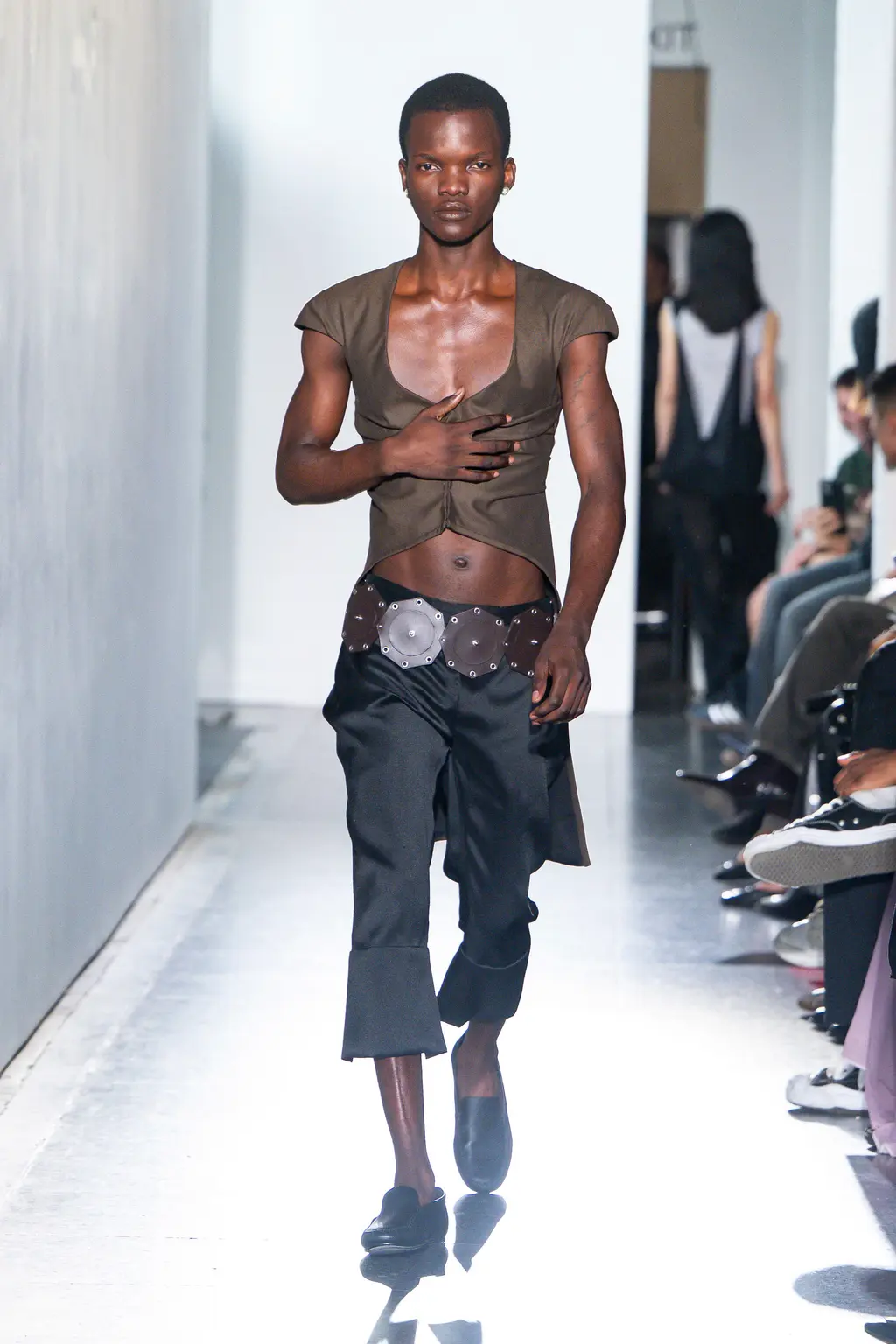 For Nuba – headed up by CSM-educated Cameron Williams – this was the last of three collections under Fashion East, and he continued a draped yet calculated approach to tailoring rooted in Afro-Caribbean diaspora. LFW newcomer Jacek Gleba took inspiration from the diaries of ballerina Vaslav Nijinsky, creating delicate, intentionally unfinished silks. For fellow newbie, Louis Mayhew, formerly a construction worker by day, this season included a heavy-duty, trade-inspired capsule and it marked his introduction to womenswear.