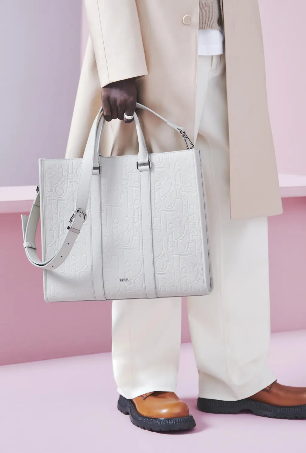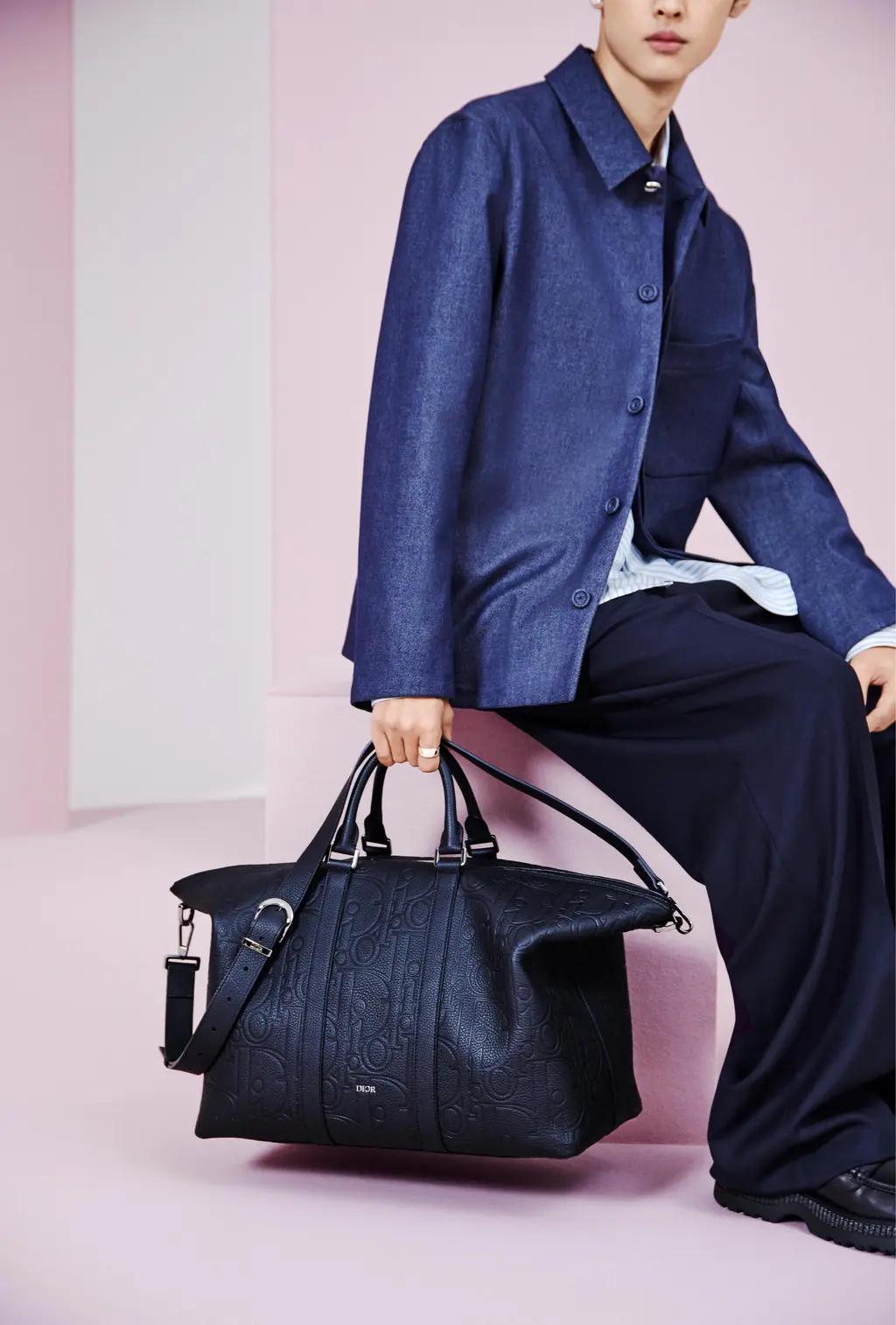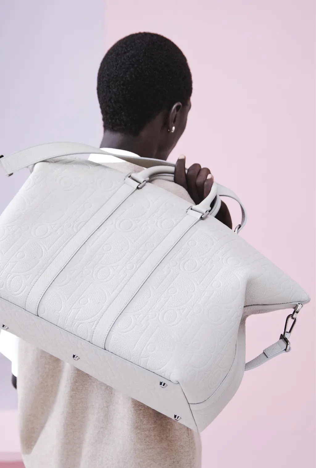 Kim Jones has tested a new technique for the range of bags he’s designed for Dior’s Fall 24 collection, Dior Gravity. It embosses the house’s motif onto buttery leather for an all-over effect that repeats “Dior” across each bag. Find the graphic on a selection of messenger and weekender bags, plus accessories including a belt, card-holder and B33 and B27 trainers.
