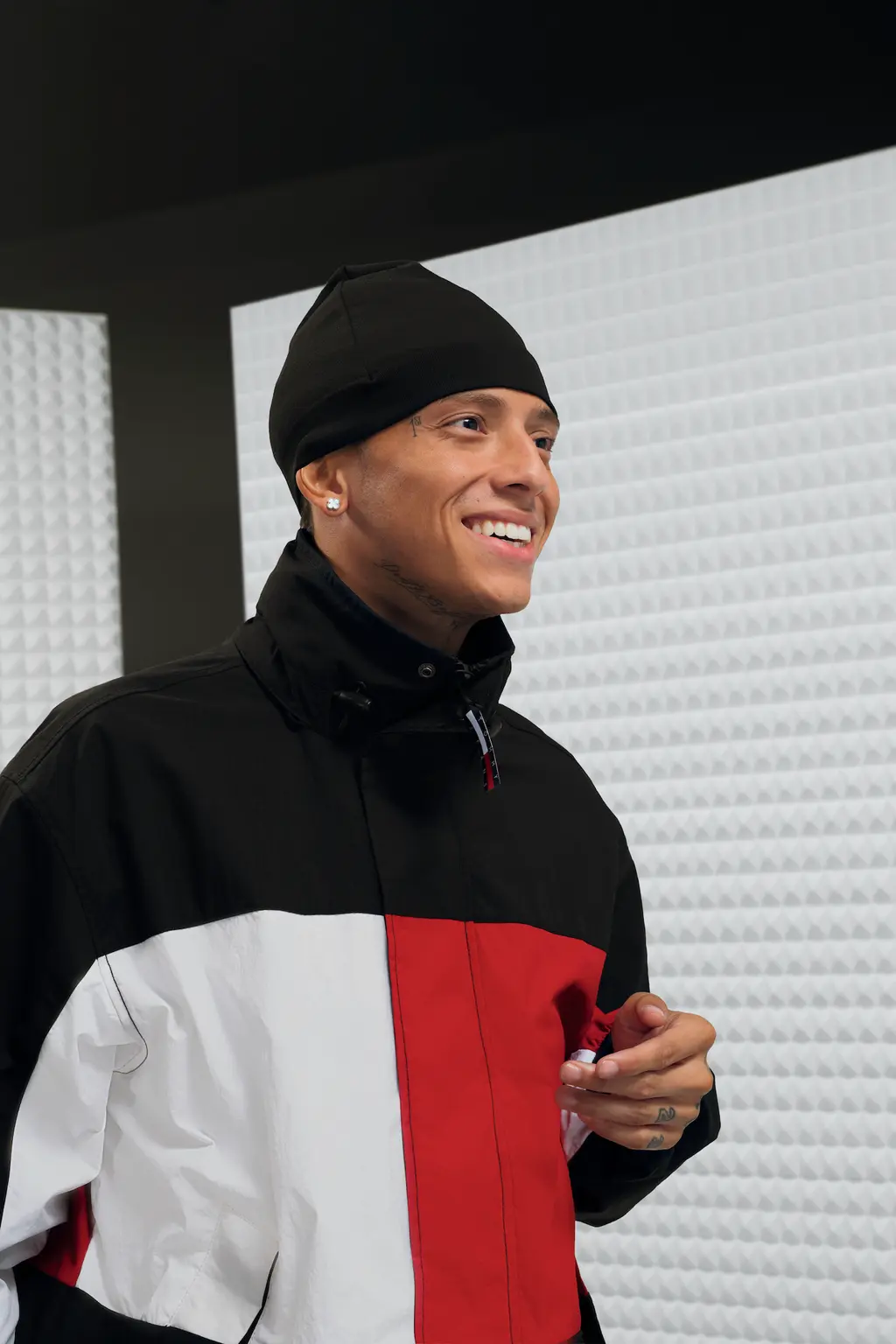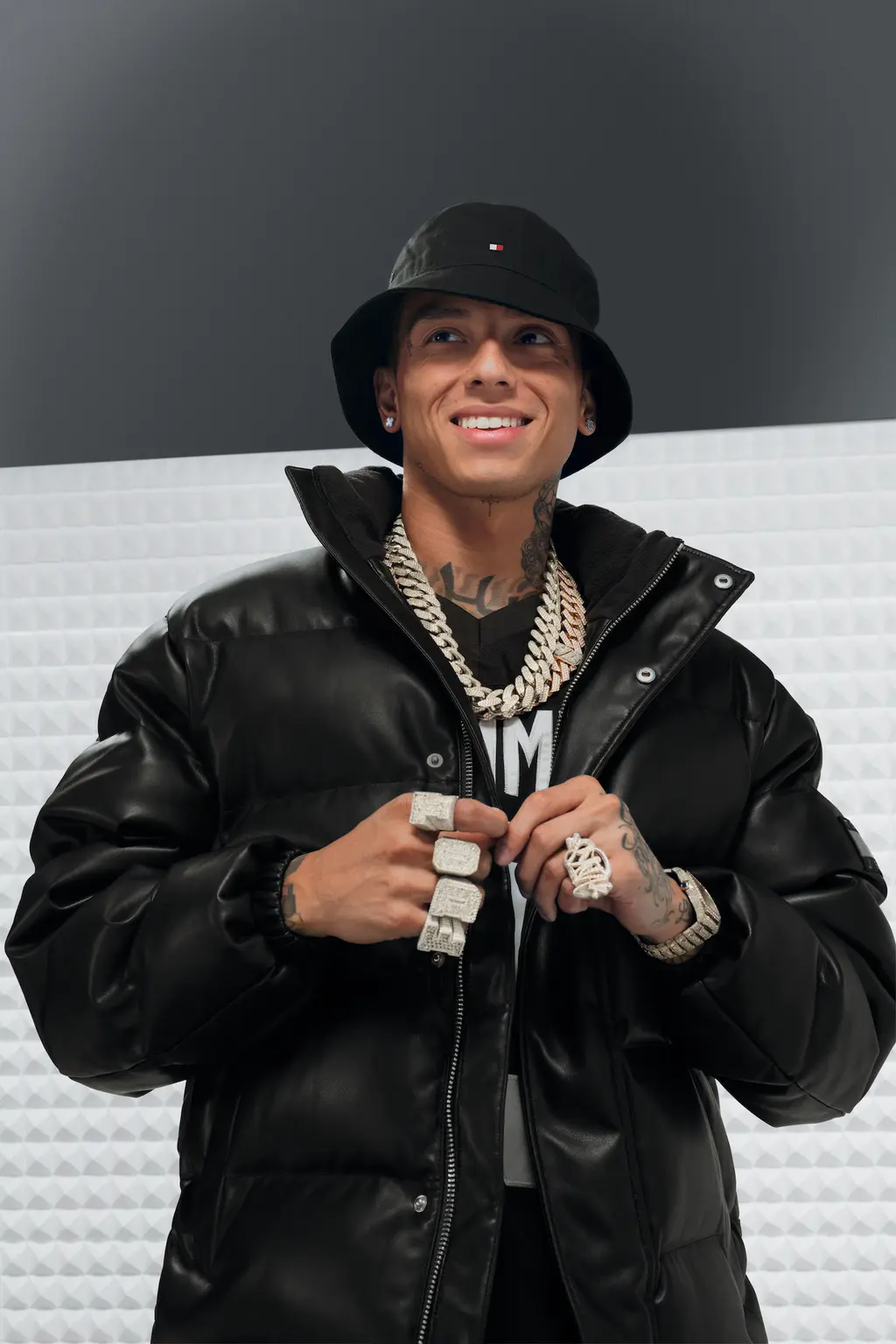 For the shoot, Cench dug out the “85” football jersey he wore for his recent On the Radar freestyle, pairing it with Tommy’s graphic windbreaker and a slick black puffer. Meanwhile, Memphis-born rapper GloRilla does smart-casual proper in a cropped rugby top, black jeans, a sharp leather jacket and cycling shorts.