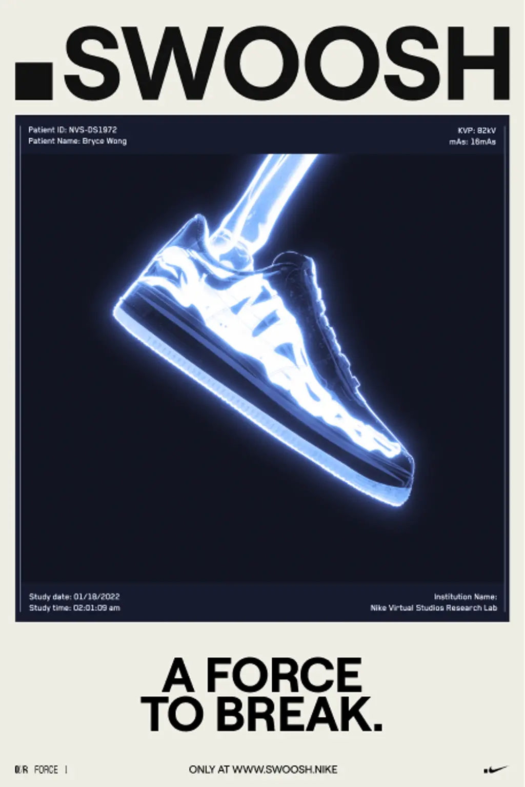 Whether you’re fretting about a robot takeover, scared AI will kill us in our sleep, or that virtuality will become the new norm, technology shows no sign of slowing down. Even Nike’s on board, having just launched its first-ever virtual collection, Our Force 1, via the brand’s digital platform .SWOOSH. Co-curated by its ever-expanding community (.SWOOSH currently counts roughly 300,000 members), OF1 comes in two digital “boxes”: the Classic Remix and the New Wave. Inside, the classic Air Force 1 has had a techy make-over, featuring beaming lights, spiky teeth and a spot of X‑ray vision. A tribute to the first 50 years of Nike, OF1 is all about looking into the future.