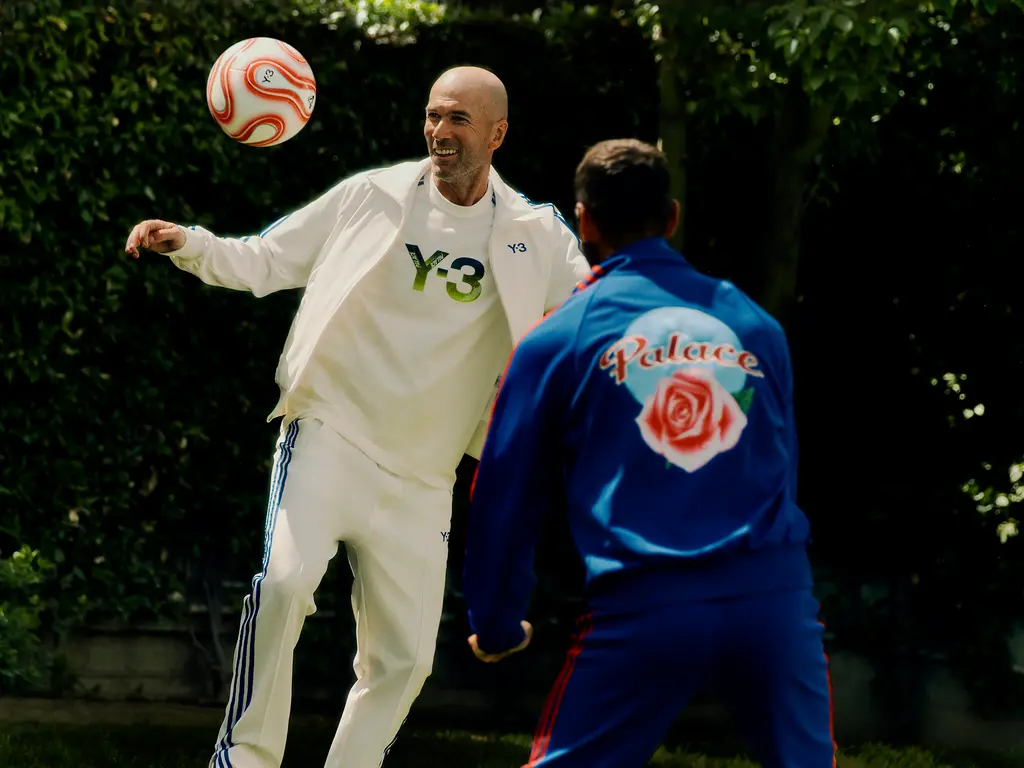 Where do the Palace lot find the time? Barely a month after their Gucci collab, the London skate brand is back, this time with Y‑3. Featuring a reversible jacket, a puffer, graphic football tees and even a tailored suit, the collection blends the naughty irreverence of Palace and the rebellious spirit of Y‑3 for an all-out collab based on archive pieces from Yohji Yamamoto’s spin-off adidas label. And it only gets better with its campaign, which was shot by Jack Davison and features footballing legend Zinedine Zidane alongside skate icon Lucas Puig. A collab of greats.