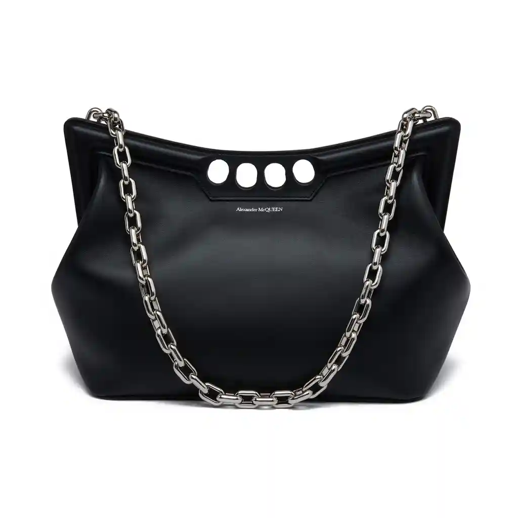 Alexander McQueen has launched its latest accessory, The Peak Bag, which features four knuckle duster-inspired holes at the clasp, a chain strap, and magnetic frame that nods to McQueen’s iconic exaggerated shoulder silhouettes. And could double as a stylish weapon, too. The campaign is fronted by Hollywood starlet Elle Fanning and shot by David Sims in classic moody McQueen style.