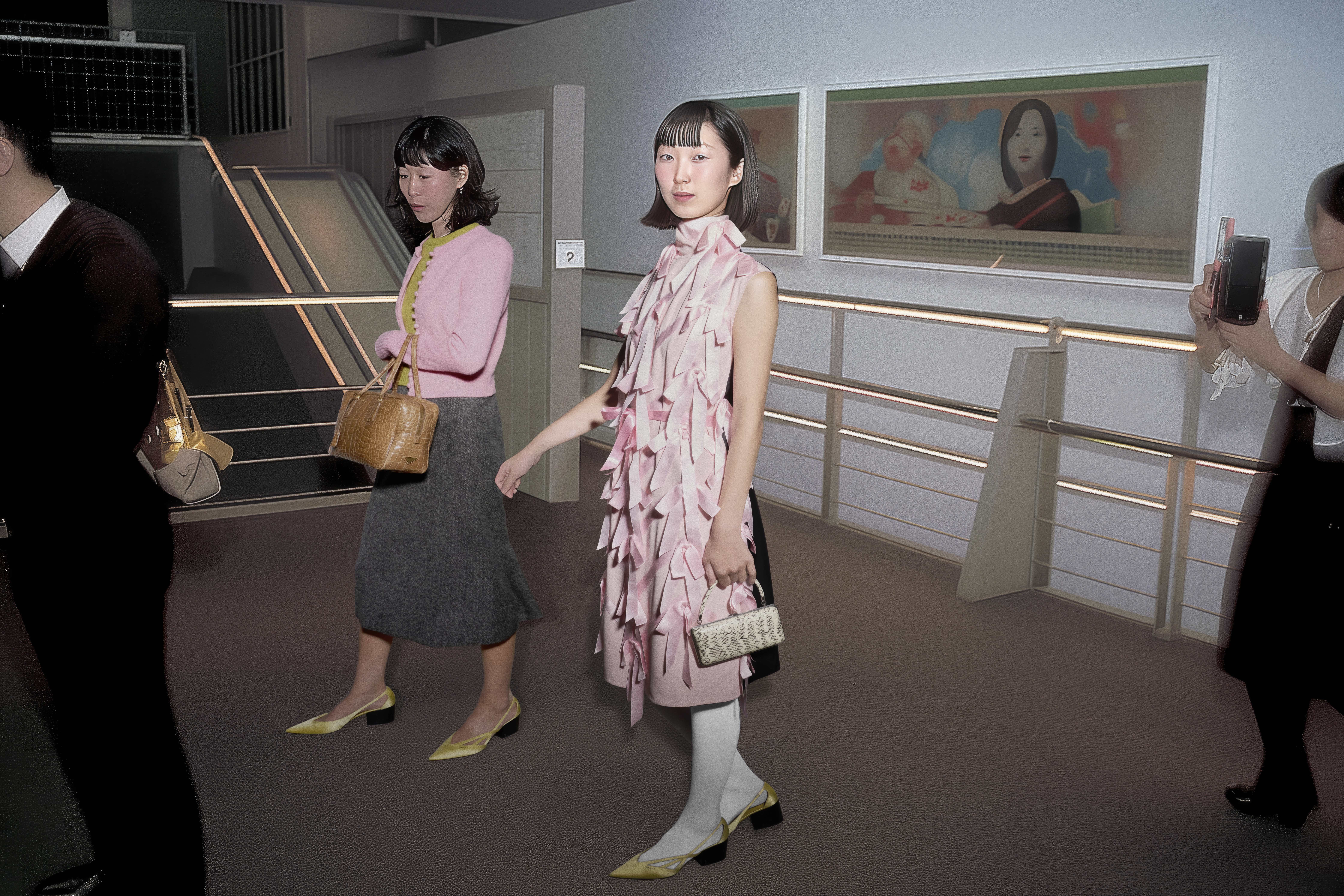 (Centre) dress, shoes and bag PRADA and tights FALKE (left) jumper, cardigan, skirt, shoes and bag PRADA (far left and far right) all clothing and accessories computer generated