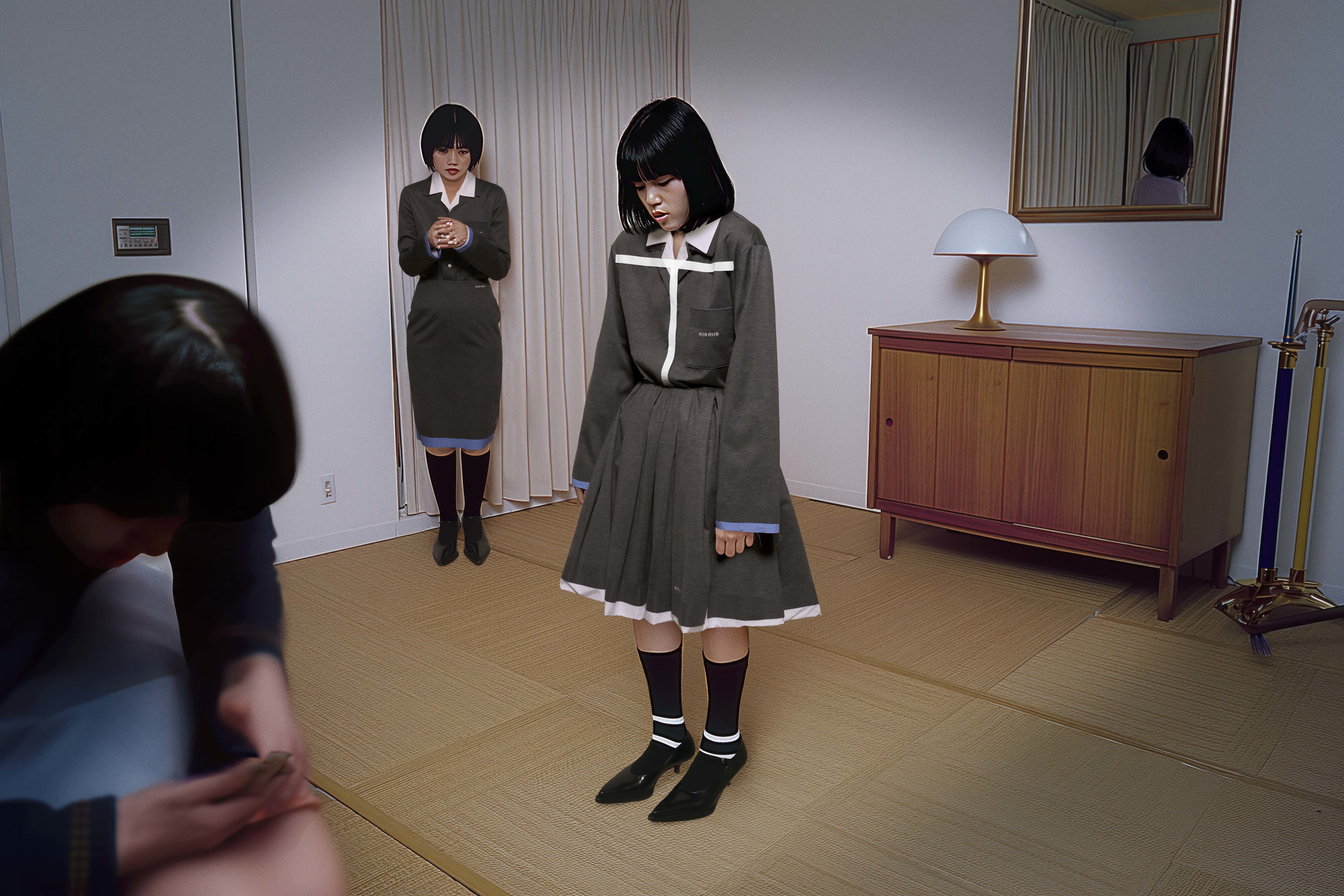 (Right) shirts, skirt and shoes MIU MIU, socks FALKE and tape stylist’s own (centre) jacket, shirt, skirt and shoes MIU MIU and socks FALKE (left) jumper computer generated