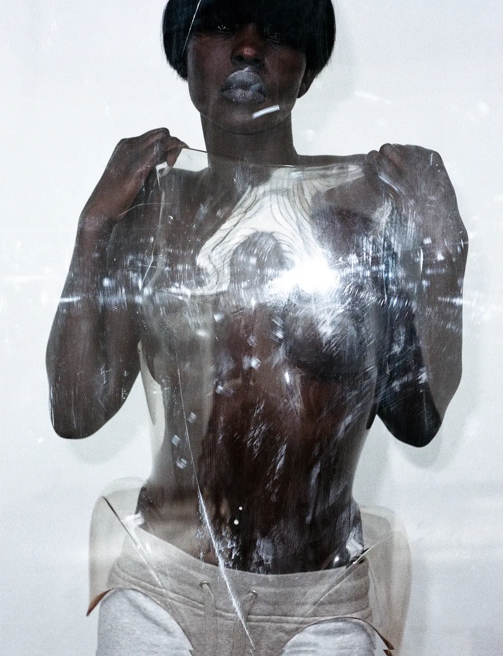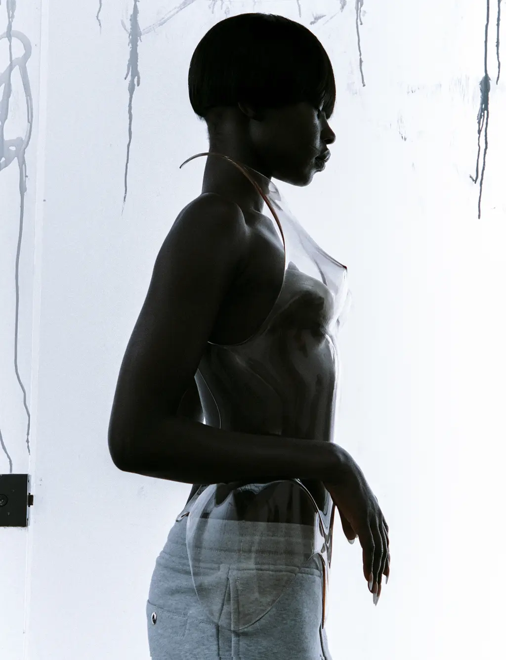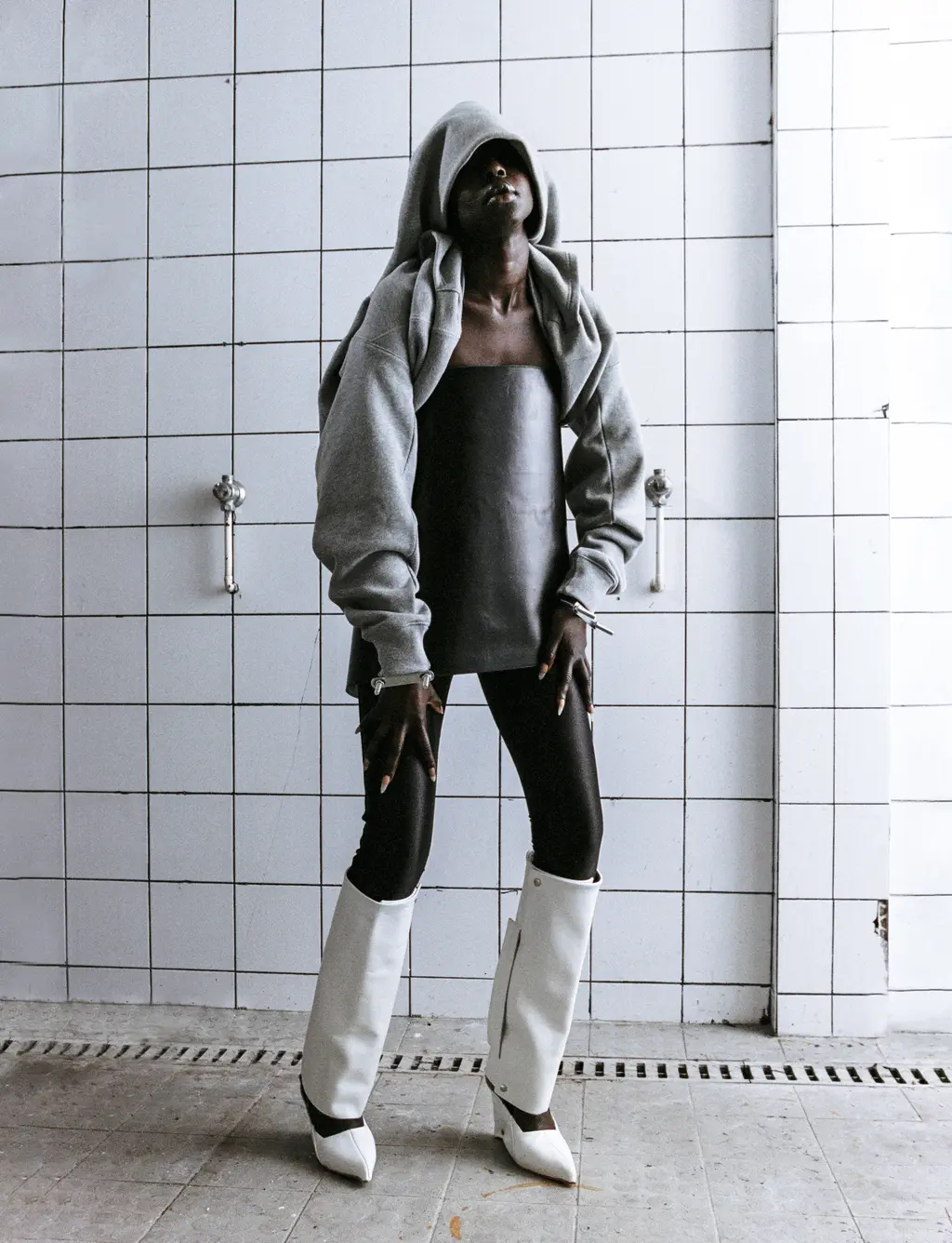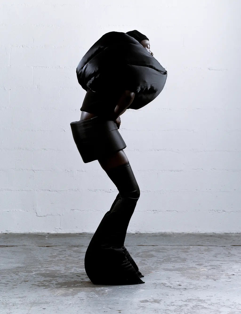 Aweng wears dress BALENCIAGA, shoes RICK OWENS and earrings LORETTE COLÉ DUPRAT