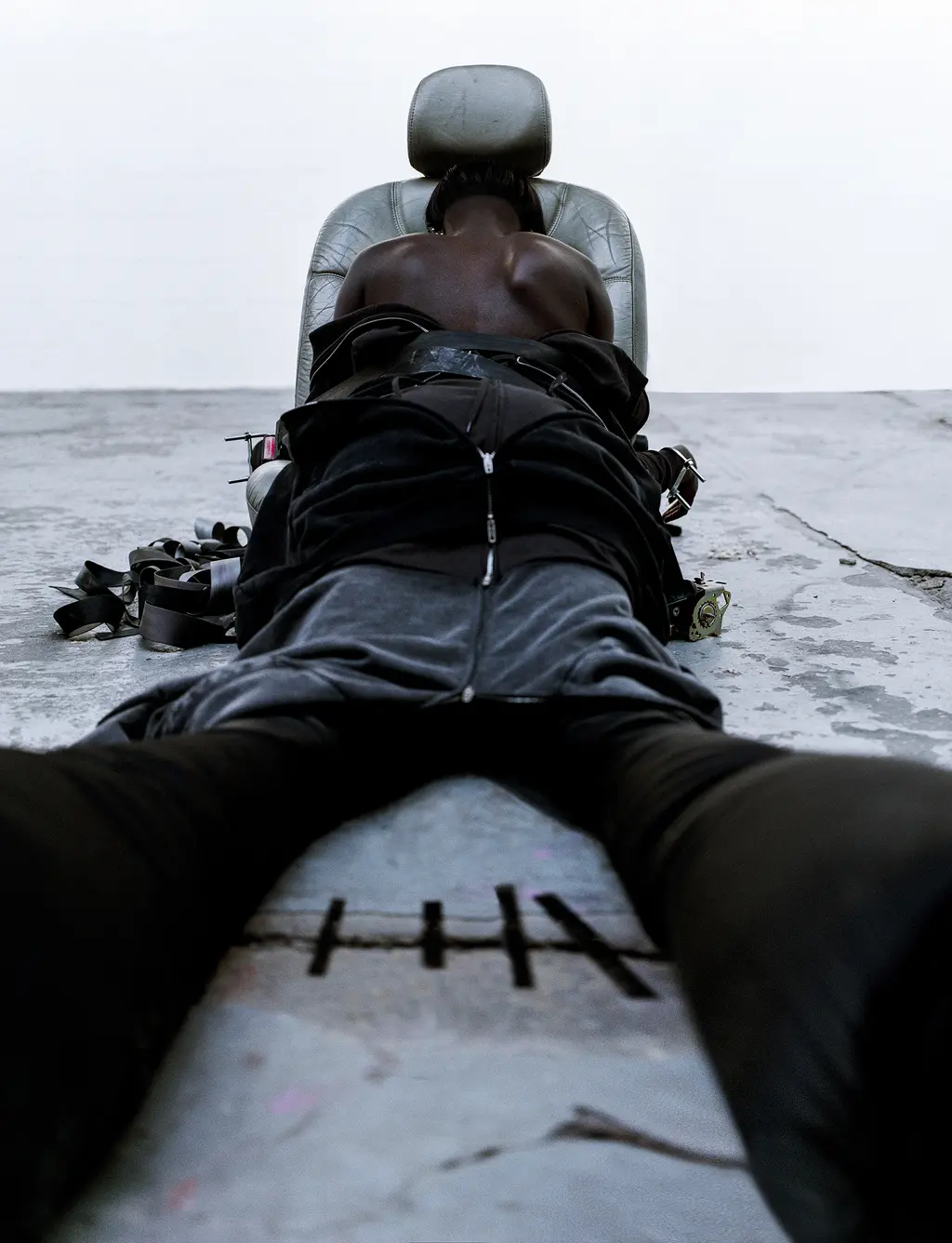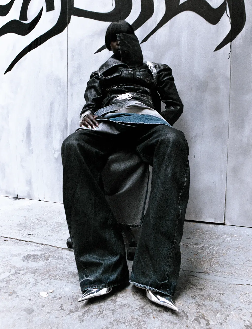 jacket and shorts PROTOTYPES, skirt stylist’s own, shoes RICK OWENS, sleeve decal MAX CLAASSEN and jewellery BALENCIAGA