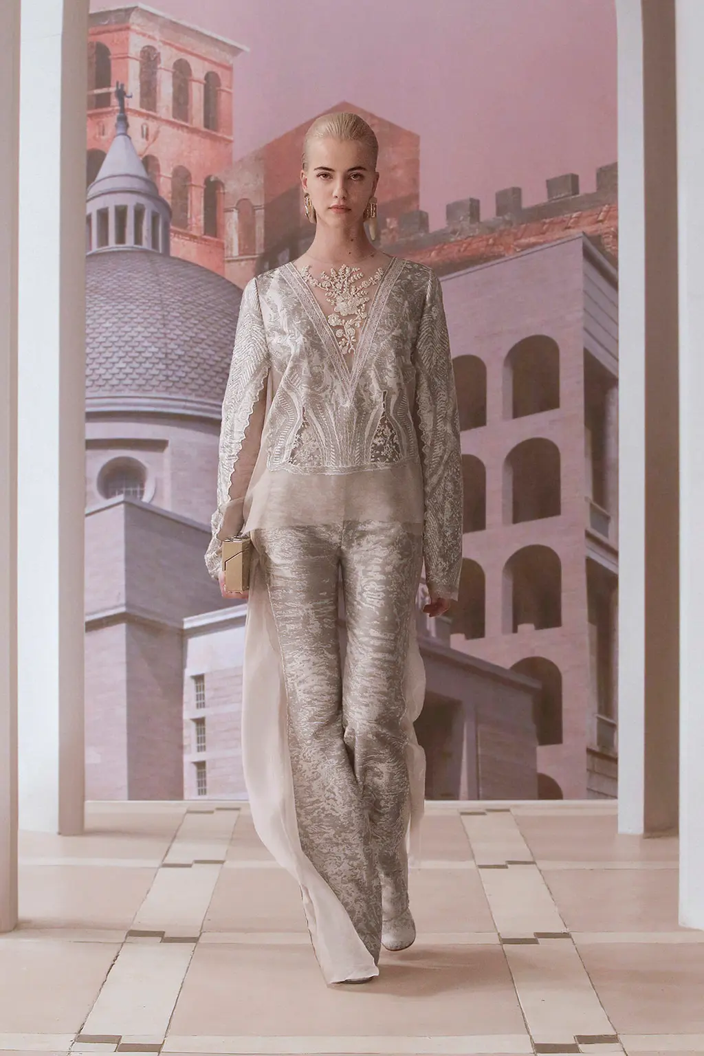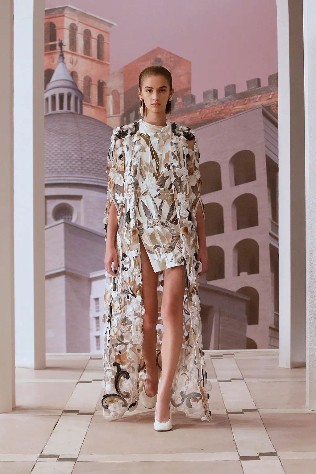 Jones paid attention to the Accattone and Mamma Roma director’s observations of Rome becoming modern, specifically connecting the old with the new, the past with the present, throughout the collection. In a “nothing is quite as it seems” approach, Jones used fabrics to impose illusions. A corseted, floral-embroidered dress seemed completely transparent, but wasn’t. An evening jacket looked as though it was protruding off the body, tiled like a mosaic, and an off-white evening gown presented as though caught in the wind.