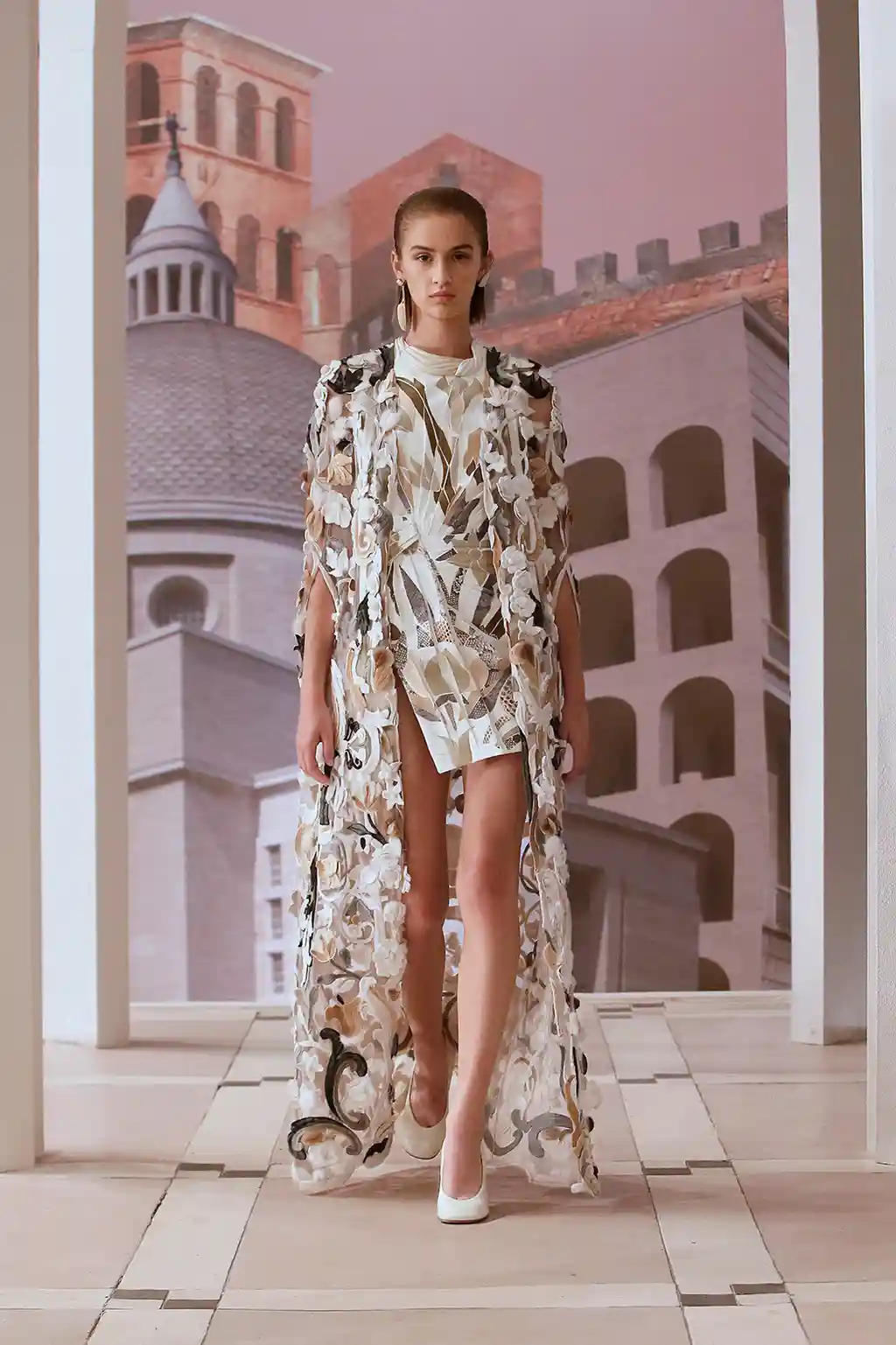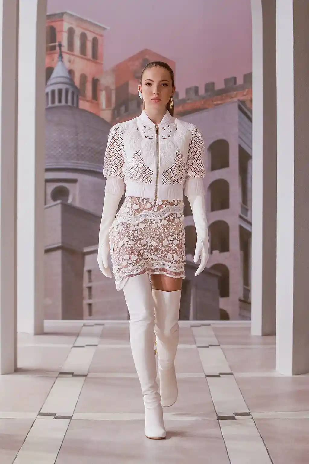 Marble drapery was presented through trompe l’oeil silks and heels of shoes were constructed from marble, too, giving the wearer a silhouette of strength. The theme continued with delicate lace mini dresses complete with intricate embroidery.