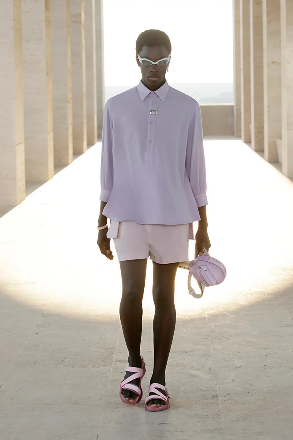 While the pastel-hued tones of the collection, a frothy kaleidoscope of dusty pinks, lavenders, and ice blues, might feel classically Mediterranean, the proportions of some of the ab-baring tailoring and cropped jackets went for something distinctly more of-the-moment, ready to be worn for a first post-lockdown night out in the darkest – and sweatiest – of corners. Most eye-catching of all were traditional Italian-cut blazers with neon ties, sliced at the bottom of the lapel for the ultimate ab-baring look. Meanwhile, a rave-ready cropped technical jacket also came with the model’s belly button very much on show.