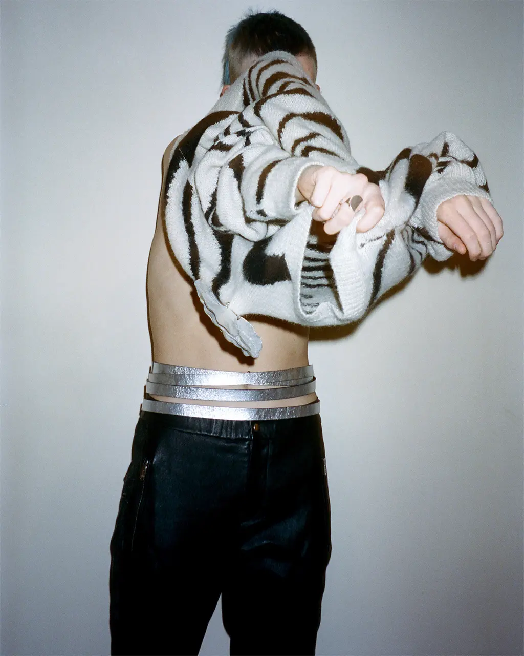 Finn wears jumper, belt, trousers, socks, shoes, necklace and ring ISABEL MARANT