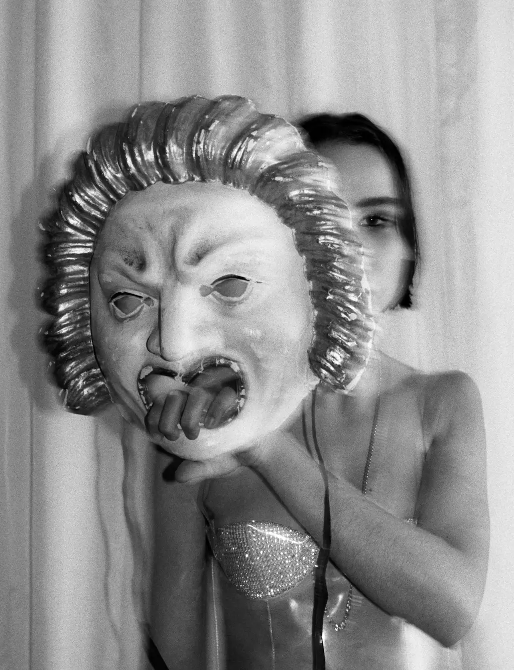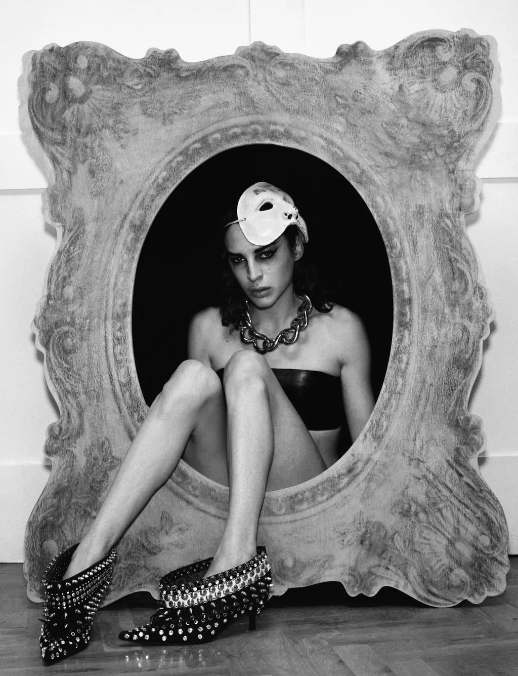 Bella wears bra ELISSA POPPY, mask THE NATIONAL THEATRE COSTUME HIRE, necklace JIL SANDER and shoes ALL-IN