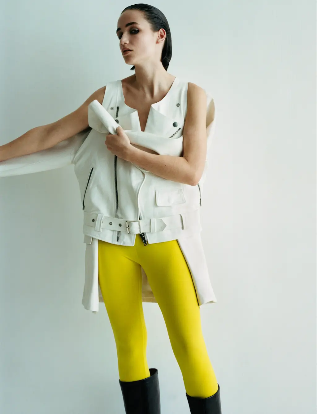 Bliss wears jacket, leggings, and boots RAF SIMONS