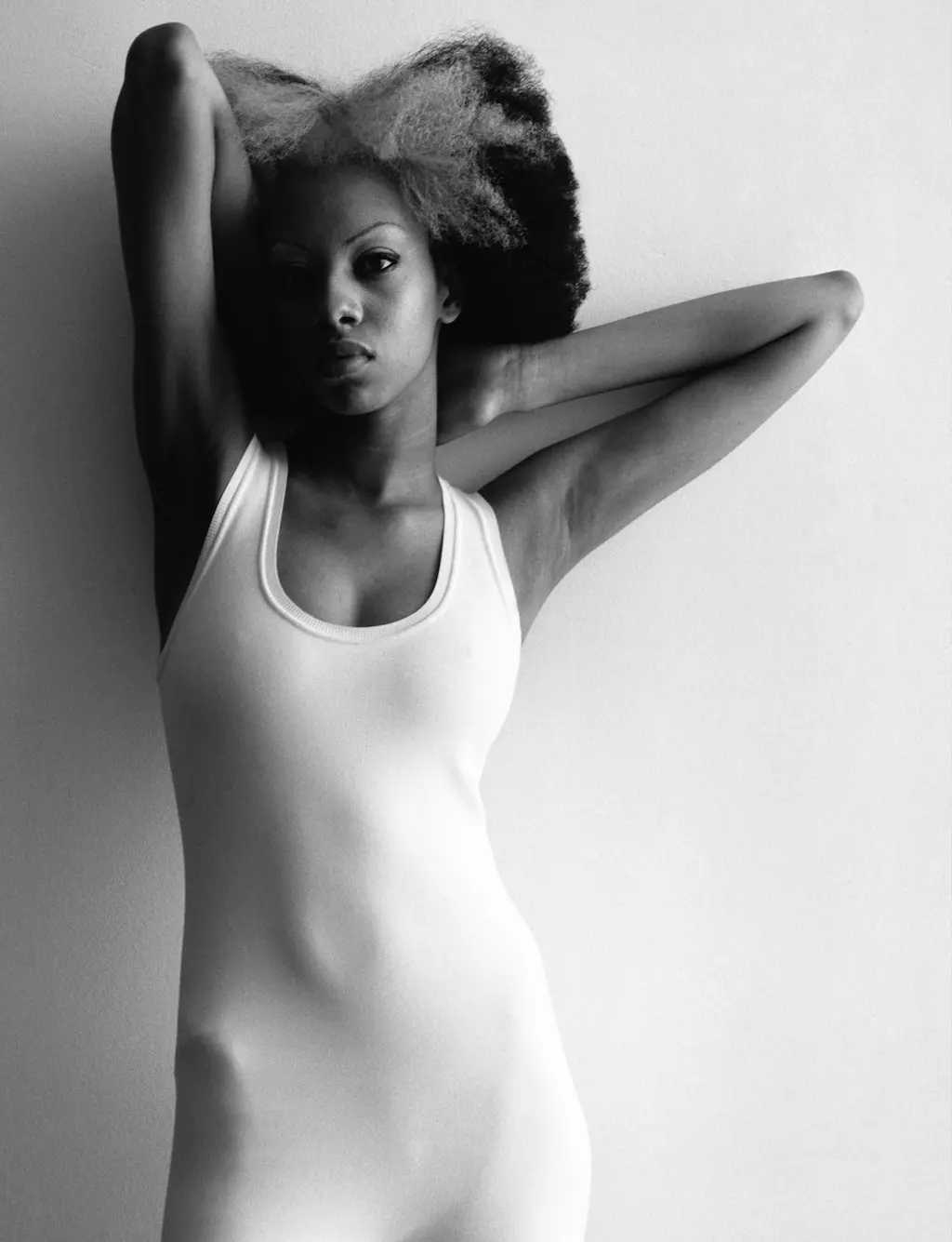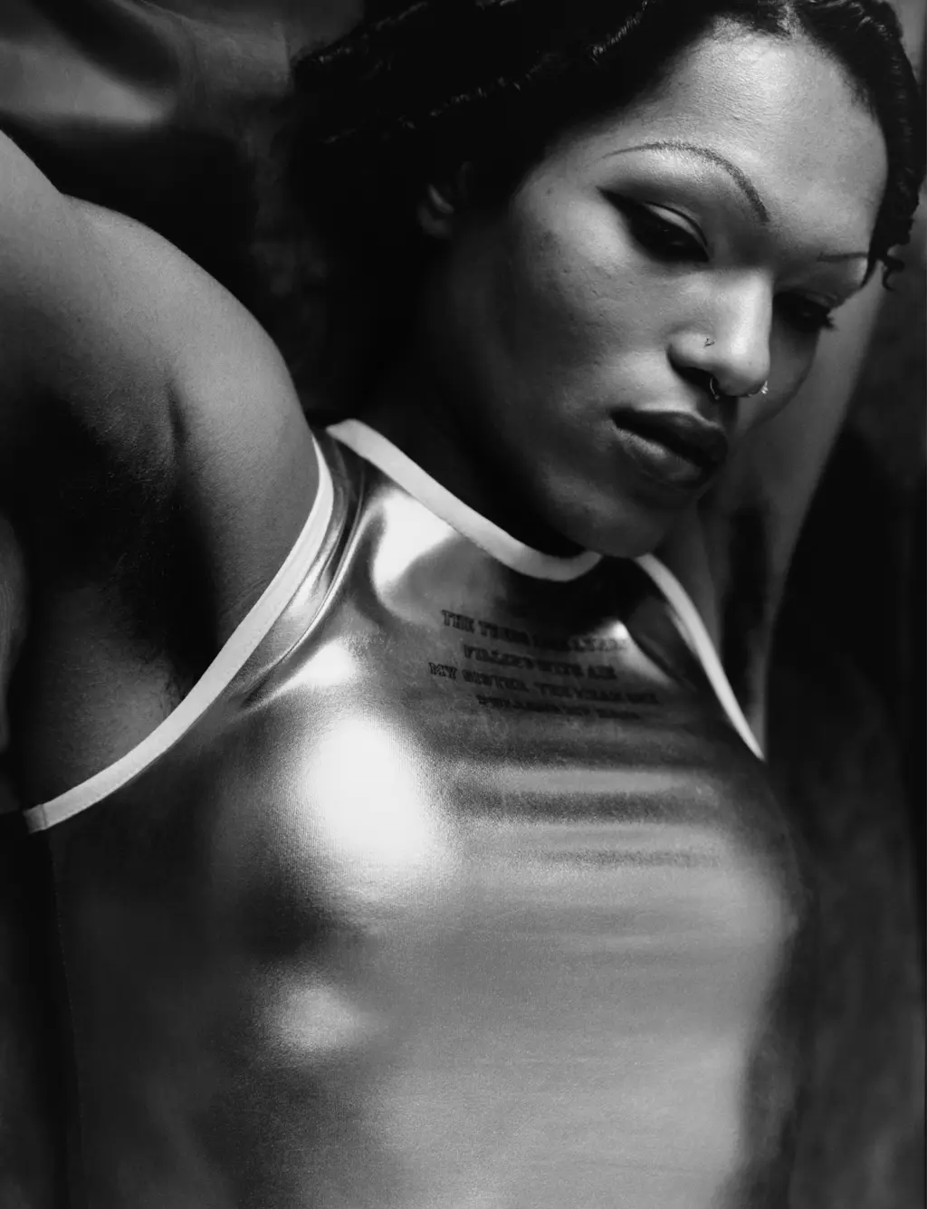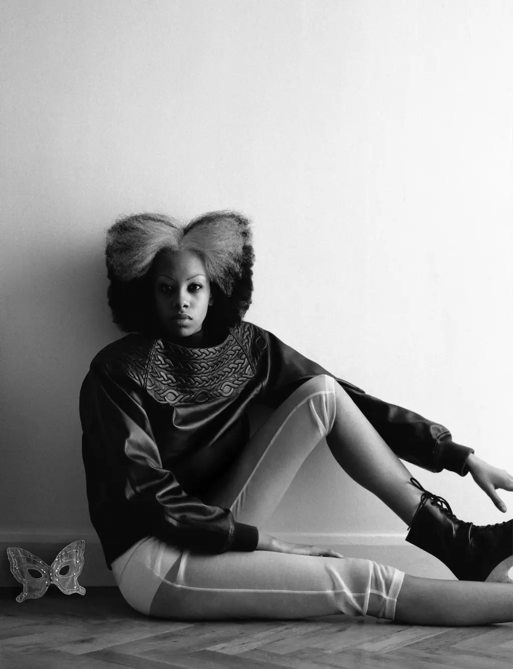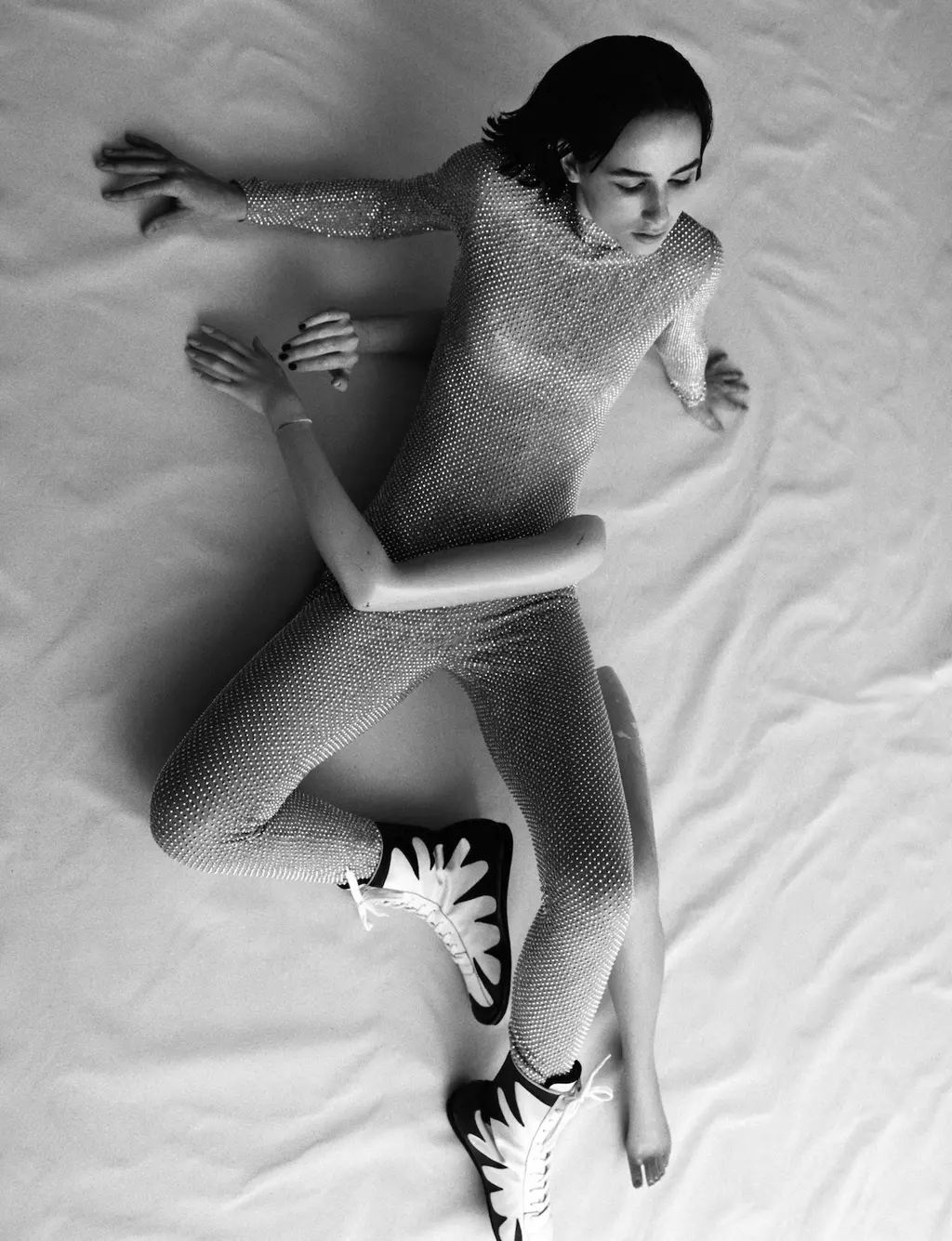 Bliss wears bodysuit and leggings DSQUARED2, bracelets PEBBLE LONDON and boots RAF SIMONS