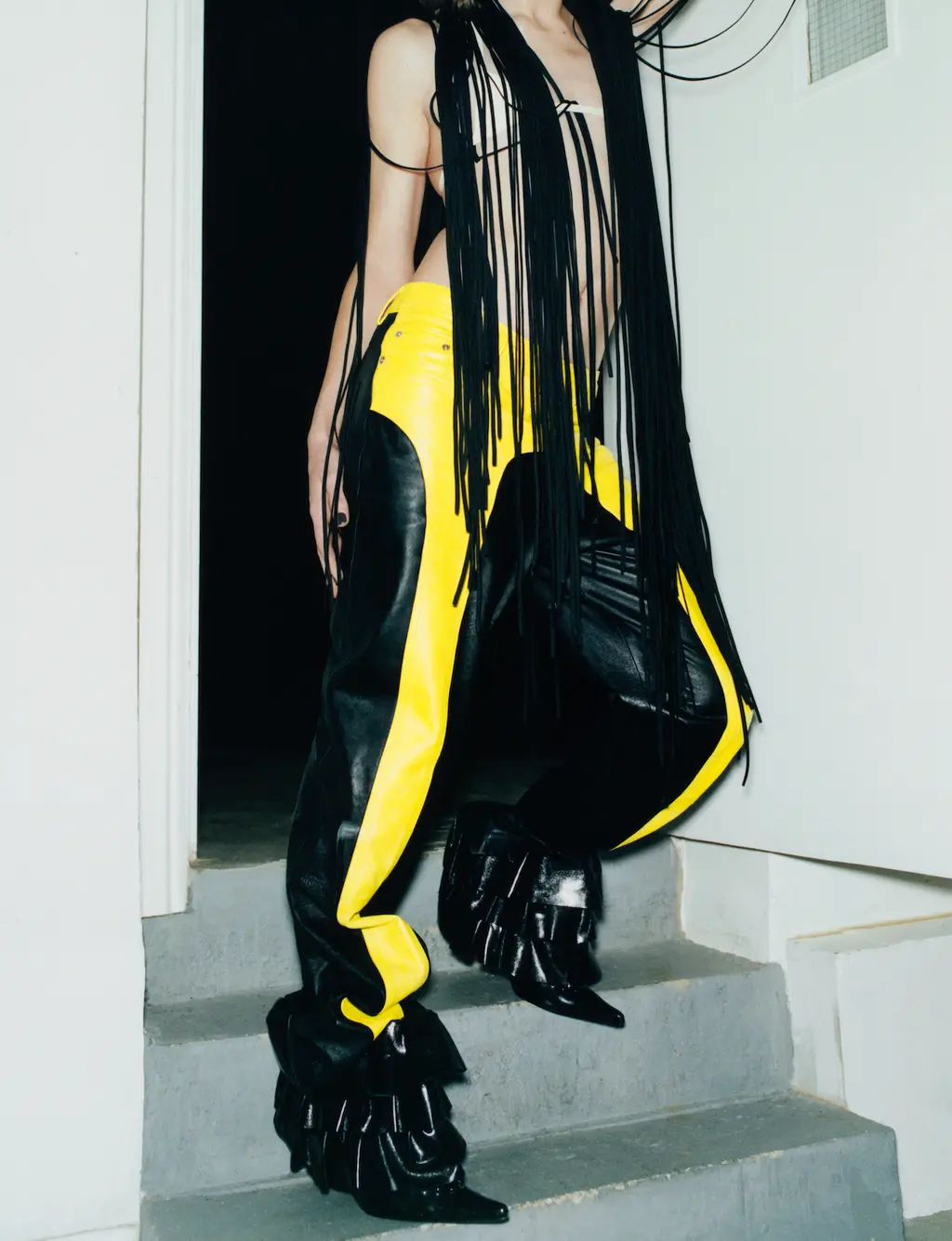 Passion wears top ACNE STUDIOS, trousers VERSACE and shoes ALL-IN
