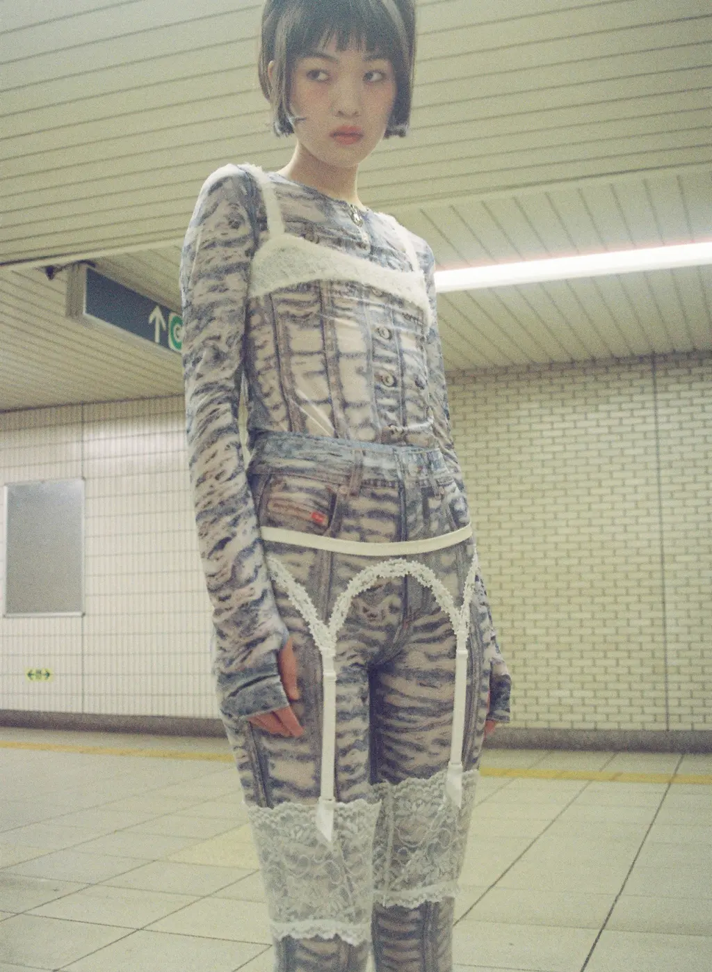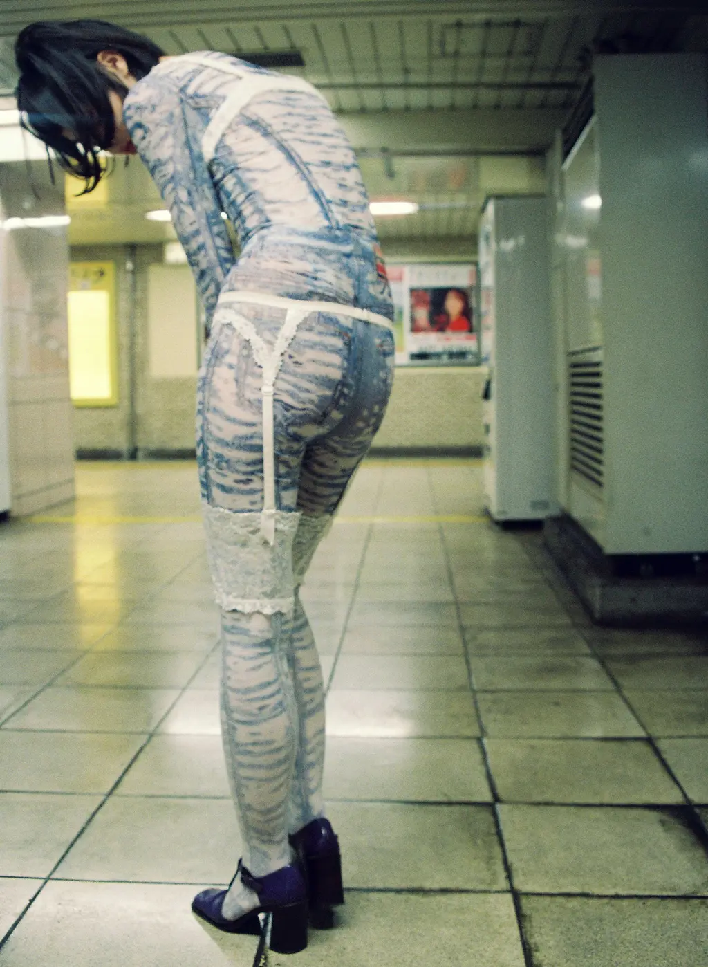 Kayu wears top and leggings DIESEL, bra ACNE STUDIOS, socks PIERRE MANTOUX, suspender belt LA PERLA and shoes stylist’s own