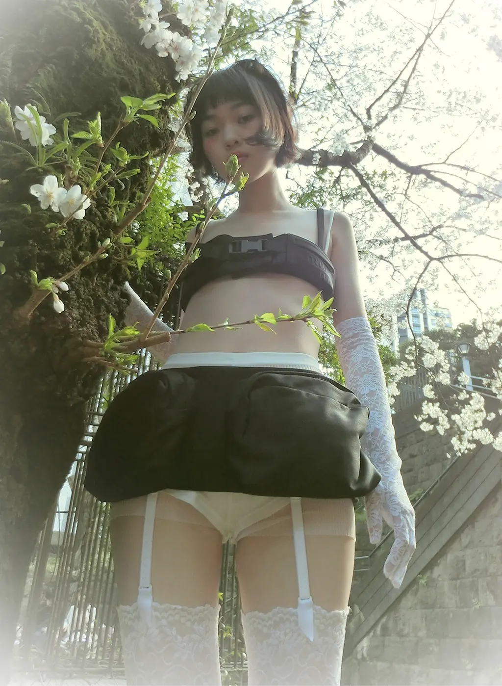 Kayu wears top, bra, skirt and shorts MIU MIU, stockings PIERRE MANTOUX, gloves MUSIC LEGS and suspender belt LA PERLA