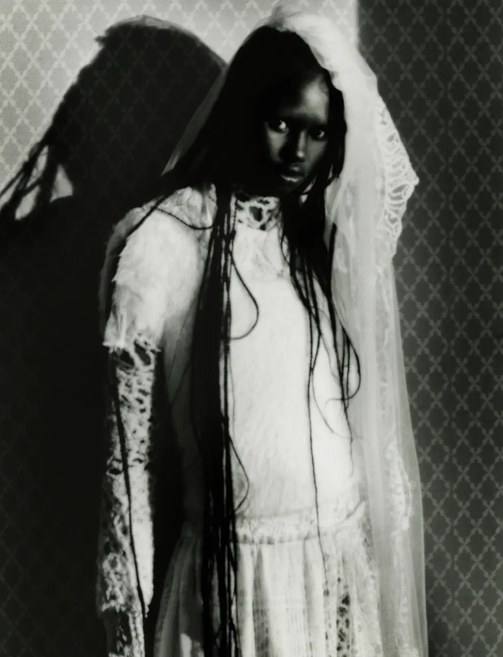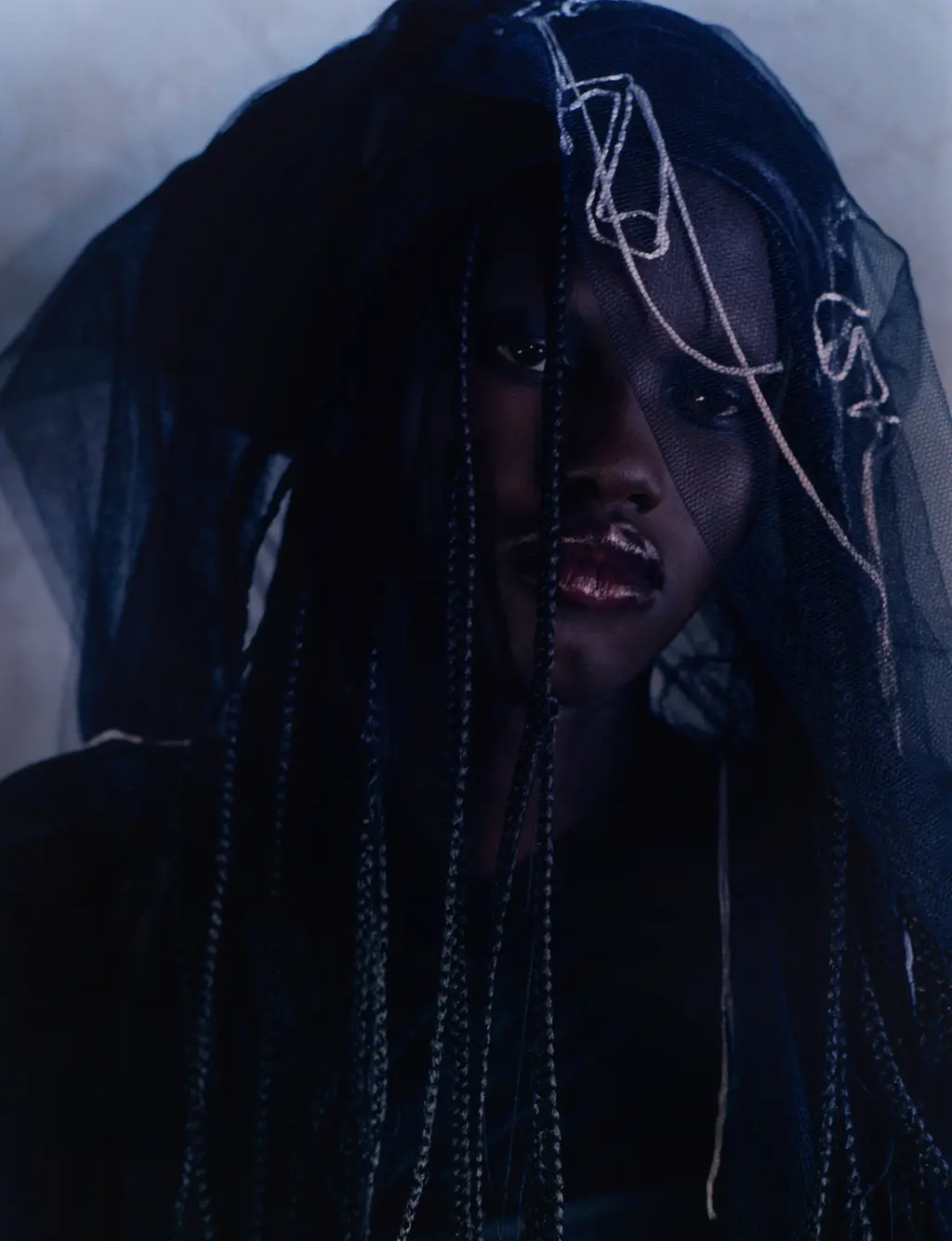 Rejoice wears dress and shoes PRADA, corset CORSETORIUM, veil stylist’s own, earring SHAUN LEANE, chest accessory THE NATIONAL THEATRE, gloves MISCREANTS, bracelets SAINT LAURENT BY ANTHONY VACCARELLO, tights FALKE and gloves stylist’s own