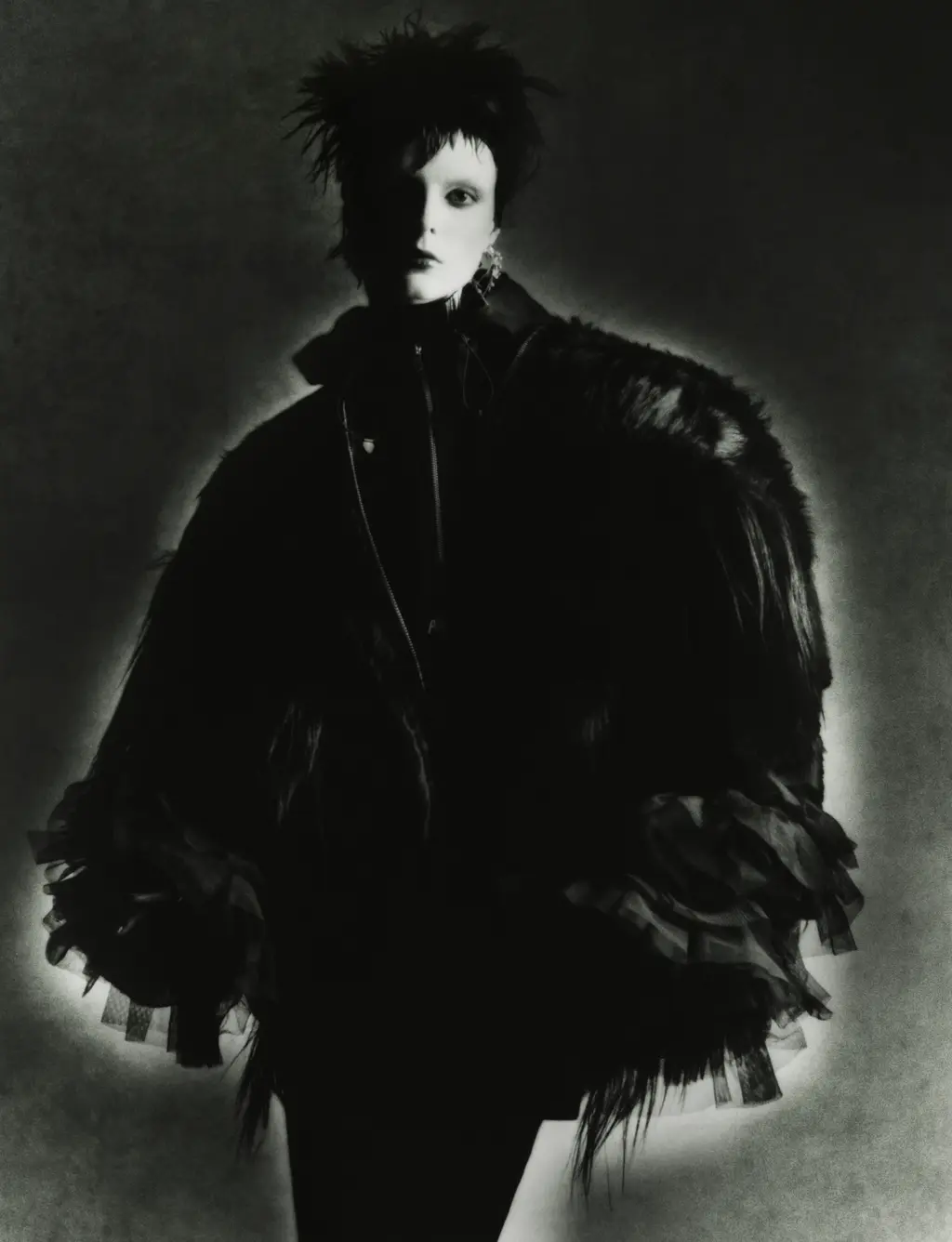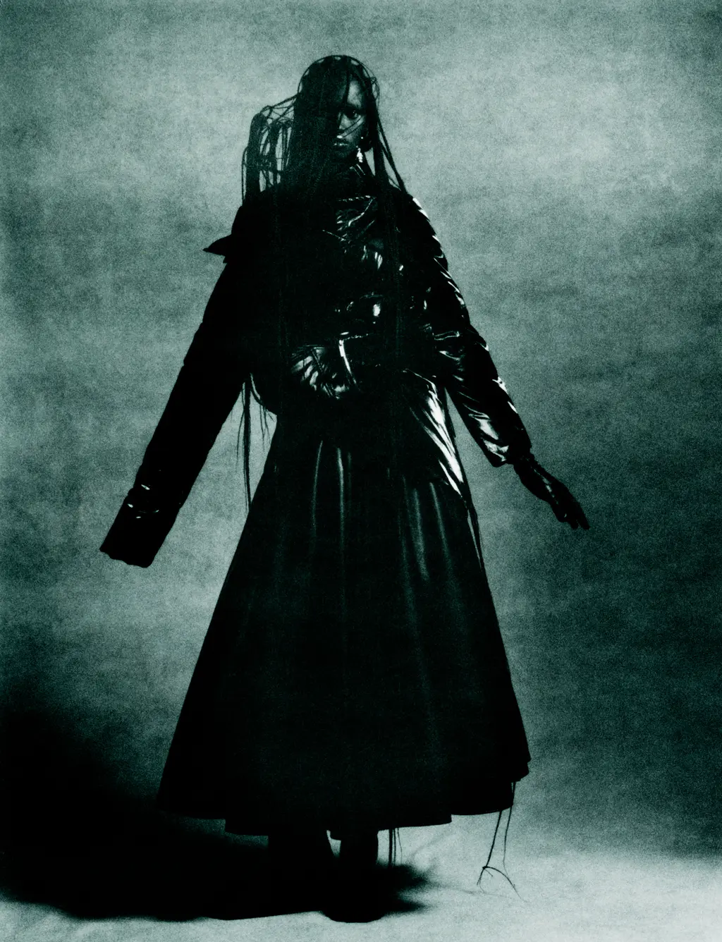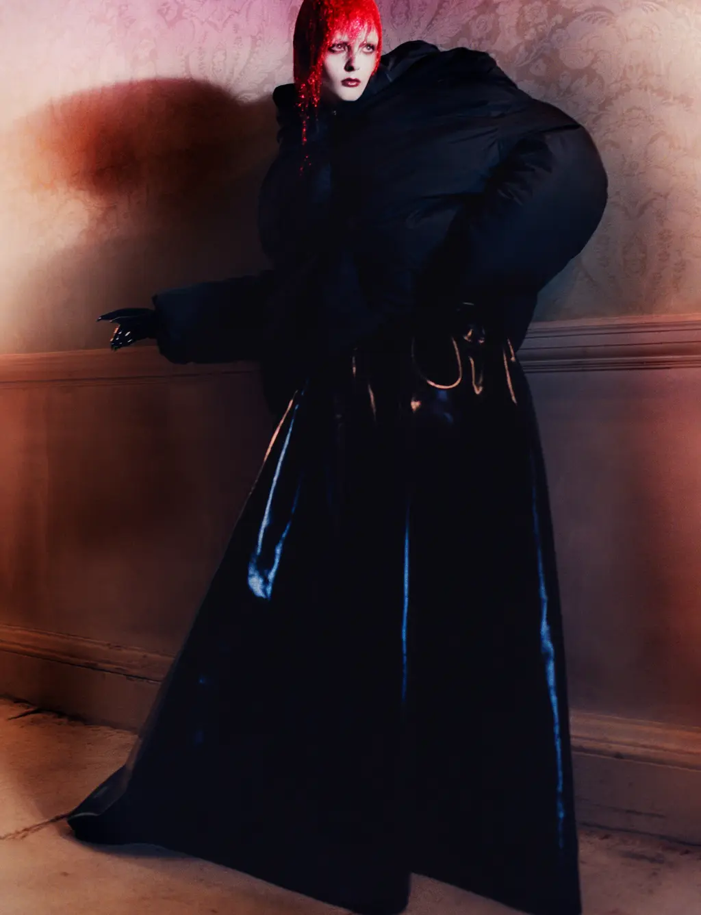 Aylah wears coat and skirt RICK OWENS, hoodie PALACE SKATEBOARDS, top MISCREANTS, headband hairstylist’s own, earrings SHAUN LEANE, choker CORSETORIUM and gloves stylist’s own