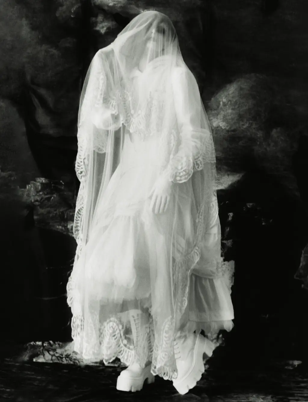 Aylah wears dress SIMONE ROCHA, jumper CARHARTT WIP, veil THE ARC LONDON, shoes CASADEI, gloves MAISON MARTIN MARGIELA and tights FALKE