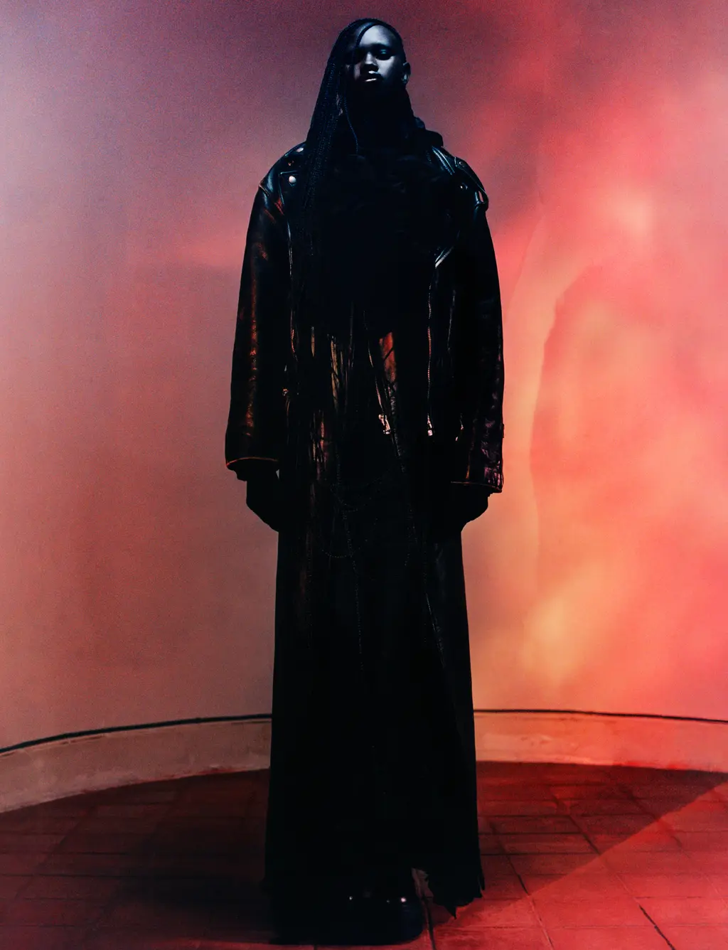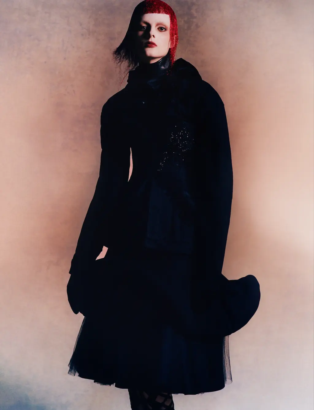 Rejoice wears jacket stylist’s own, jacket (worn underneath) ANN DEMEULEMEESTER, dress ALBERTA FERRETTI, top ARCHIVE NOIR KEI NINOMIYA AT RELLIK, necklace BLUMARINE, gloves MISCREANTS and shoes CASADEI