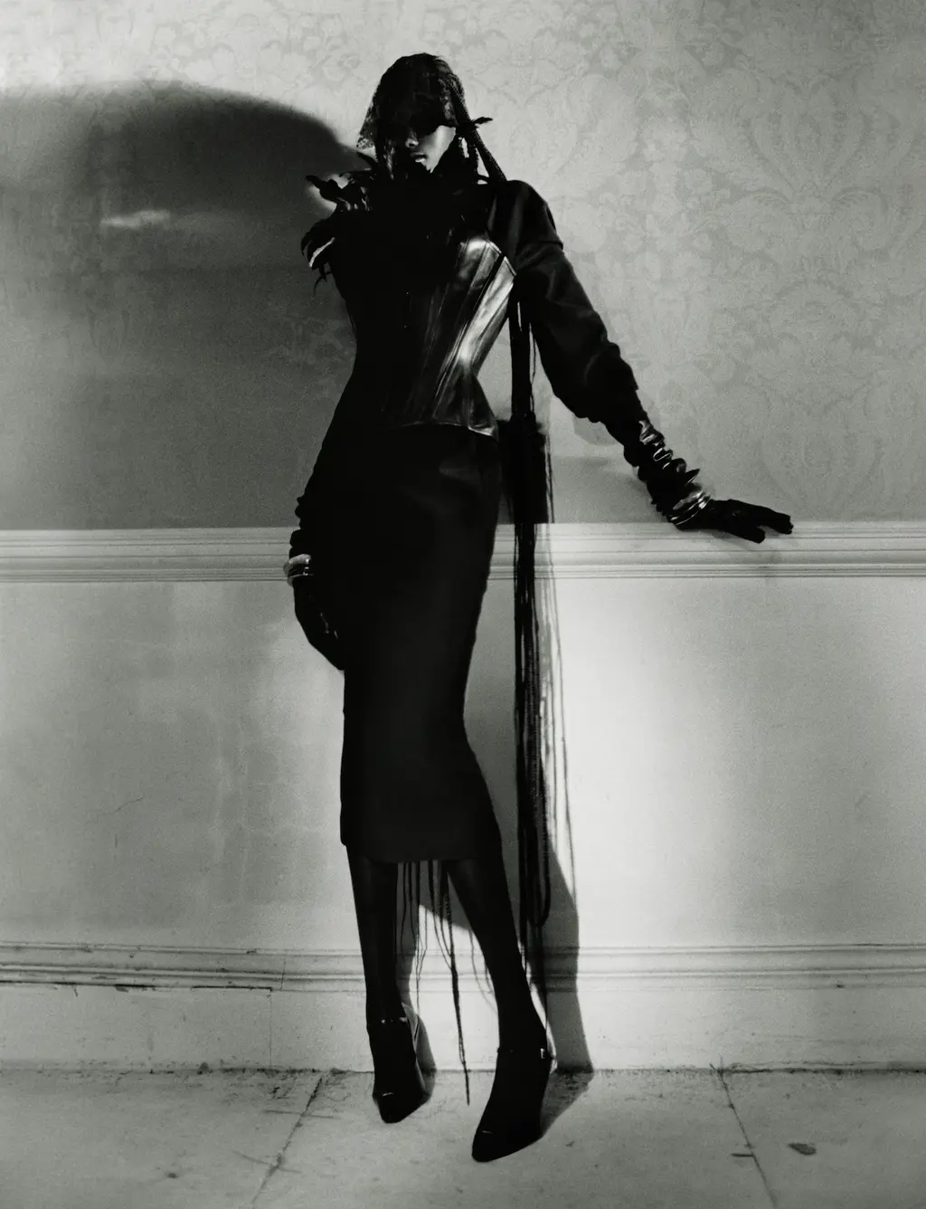 Aylah wears dress MAISON MARTIN MARGIELA, top BALMAIN, top (worn underneath) FEBEN, earrings SHAUN LEANE, gloves stylist’s own and rings AMI X ALAN CROCETTI and SHAUN LEANE