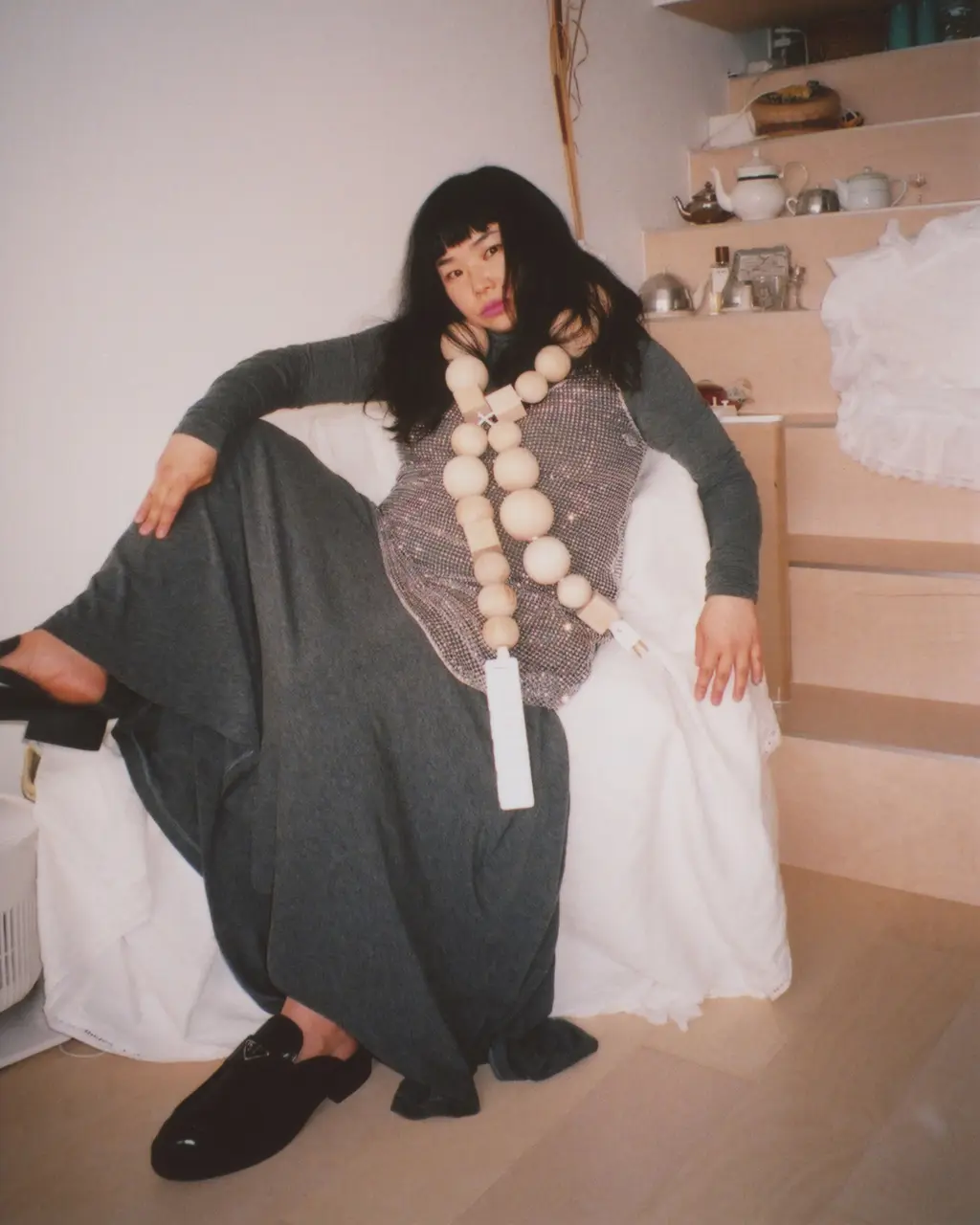 Fumiko wears dress and shoes PRADA, dress (worn underneath) SPORTMAX and plug BLESS PARIS