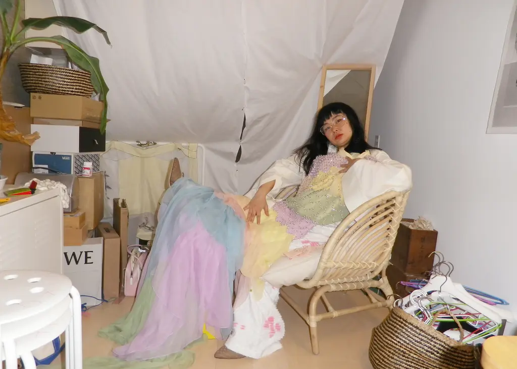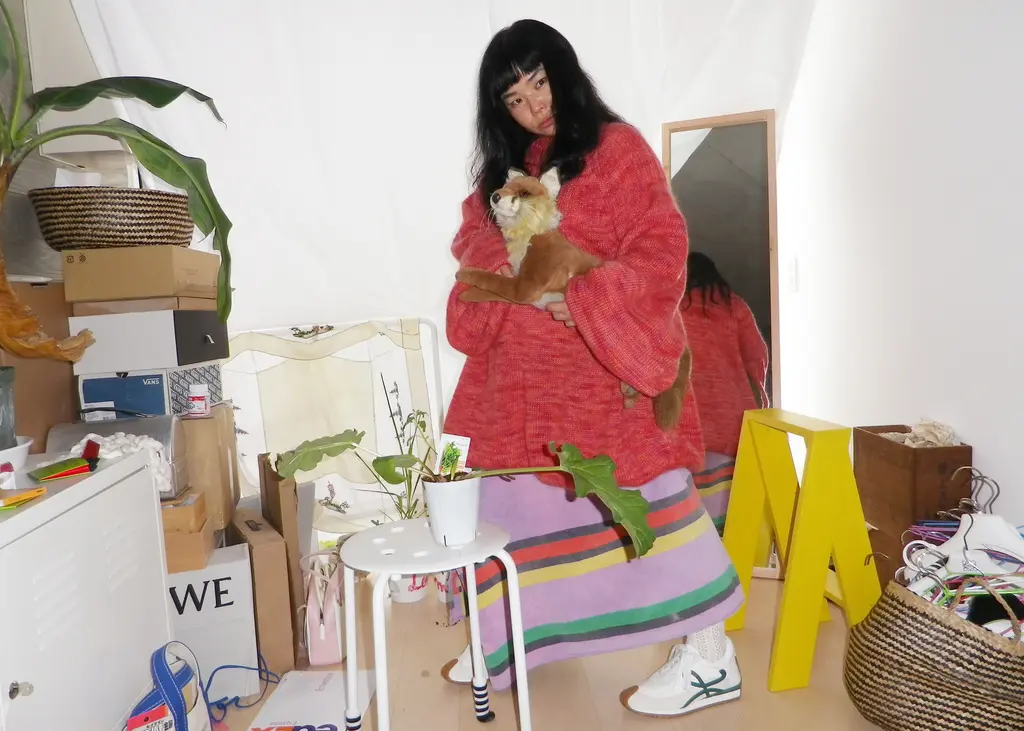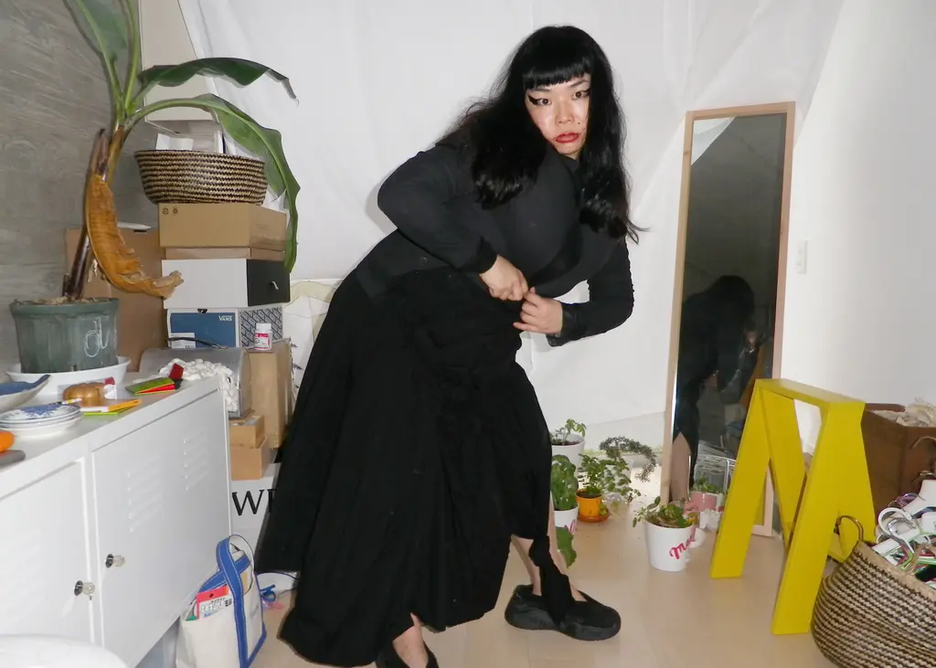 Fumiko wears jumper and shoes LOEWE and towel (worn as a skirt) JANTIQUES