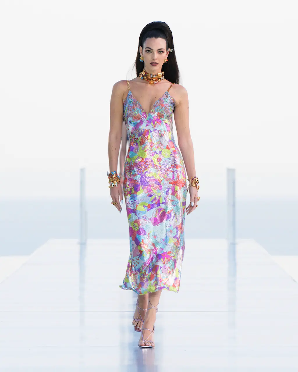 Last night’s collection launch was all about balmy nights – La Vacanza translates to vacation, after all. And the looks weren’t short of pool-side pieces: embellished bikinis and cross-shoulder swimsuits, pink terry cotton sets with matching robes (plus towel turban) and silky printed head scarves.
