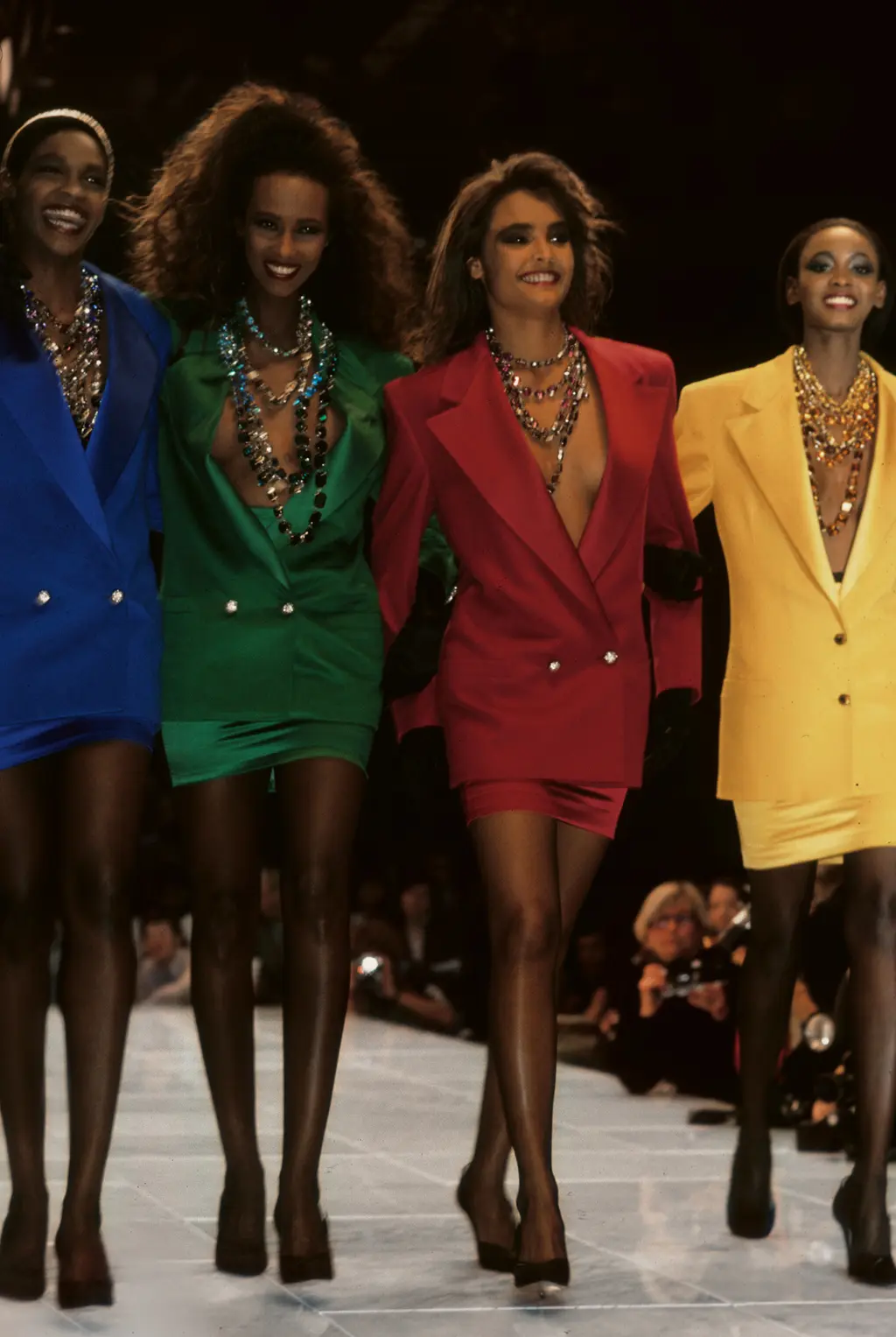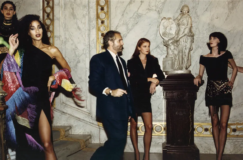 But Gianni’s subversion was couched in humour, a generosity of spirit, an enthusiastic embrace of physicality and sexuality. He gleefully tested the boundaries of taste, exposing the snobbery of his critics in the process. Gianni’s defiance was celebratory. He was an omnivore of culture high and low, hoovering up rigorous classicism, Byzantine mosaics, Renaissance art, opera and ballet alongside florid pop excess and the latest tabloid sensation. Unabashed in his love of celebrity, he courted movie stars, rock stars. His affection was reciprocated, from Princess Diana to Prince. All of these traits helped to project Gianni into the role of ringmaster – matched only by his old friend Karl Lagerfeld – as fashion transformed into the global circus that it became in the ’90s.