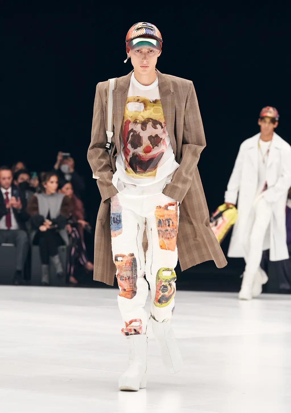 The collection was a collaboration with the New York artist Josh Smith, whose colourful work, Williams said, inspired all elements of the collection “from the embroideries to the trim”, and whose gesturally rendered paintings – including a grim reaper motif – led to asymmetrically slashed T‑shirts, knitwear and double denim ensembles.