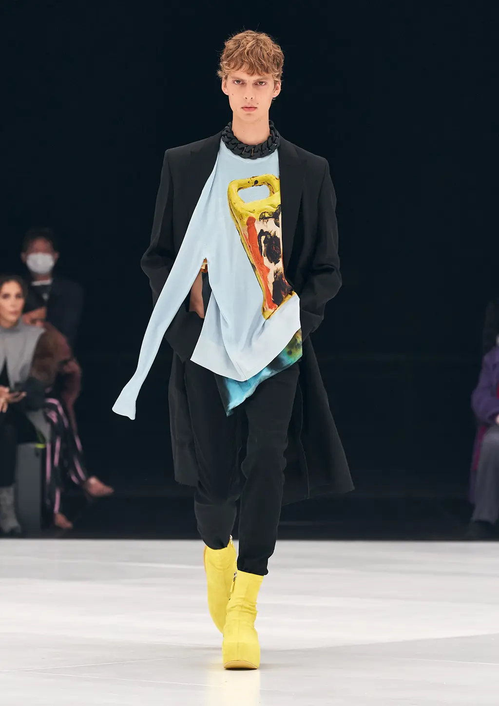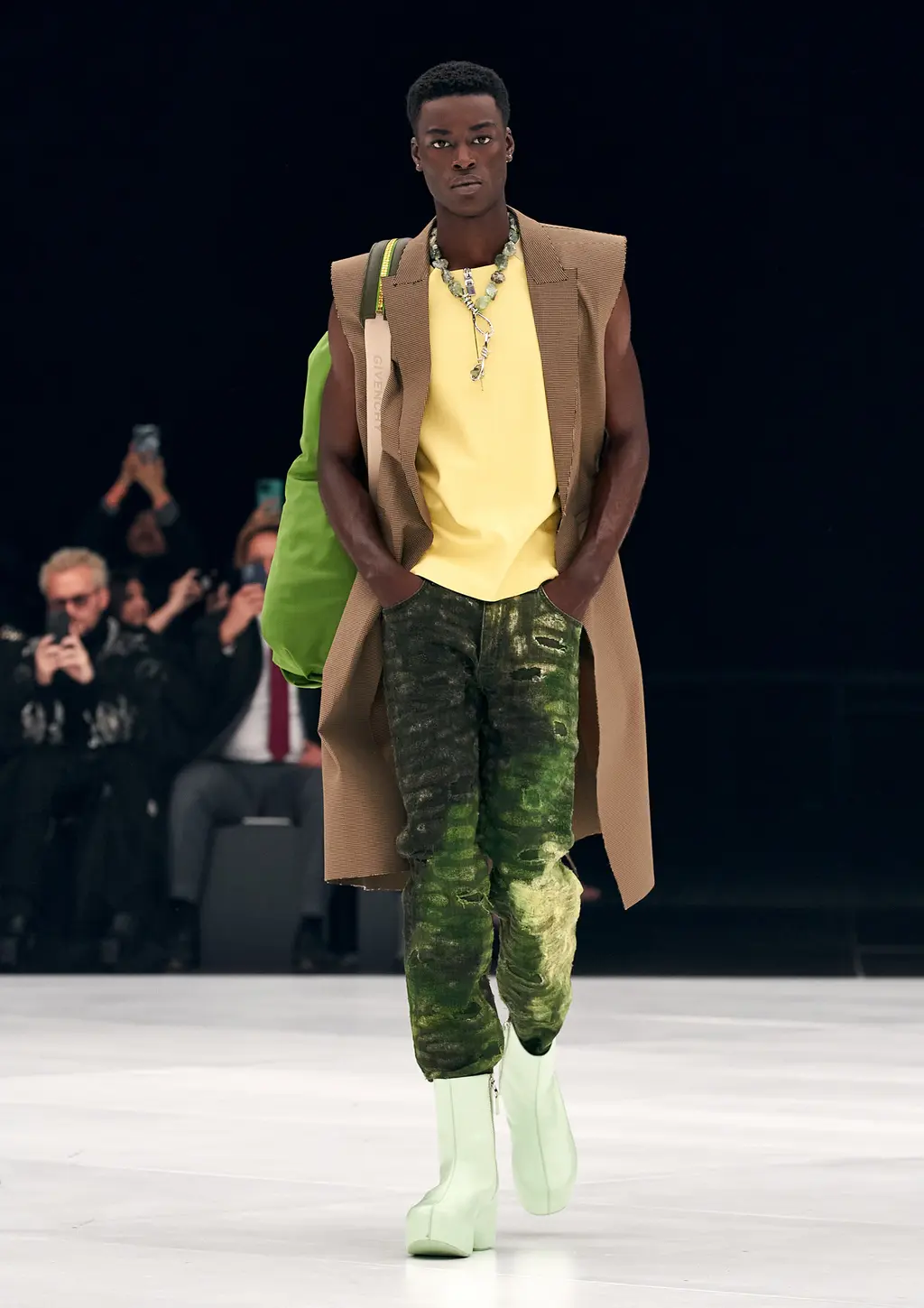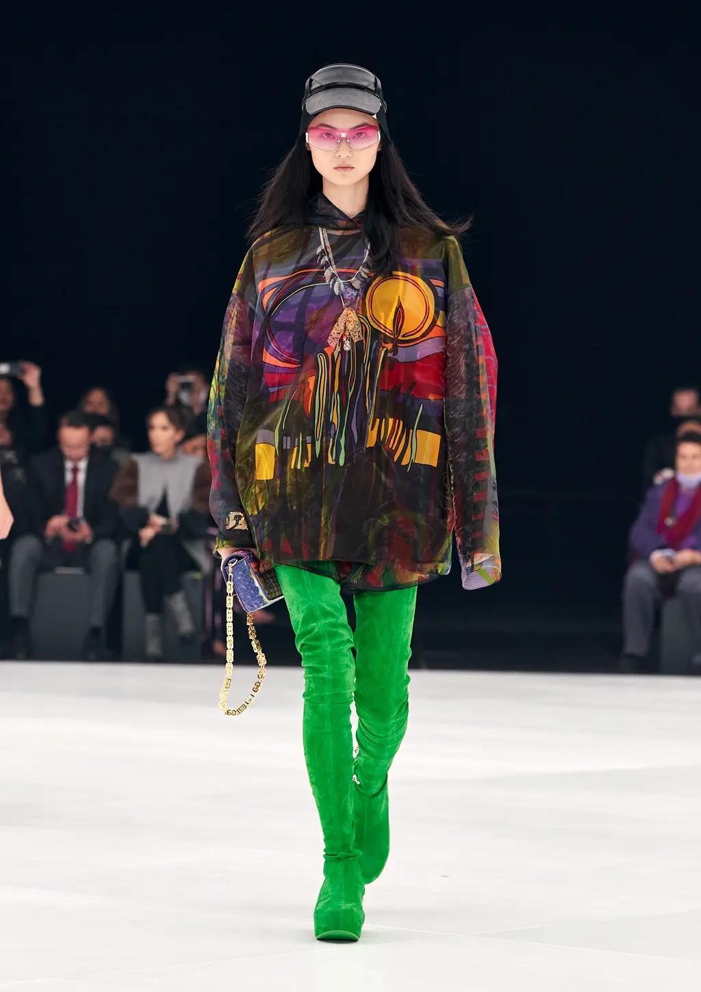 Menswear, meanwhile, took form in layered tailoring, leather accenting, Smith-adorned denim and vibrant platform boots. Accessories spanned bold statement jewellery à la AW21 – one notable misstep came in a controversial necklace which has been criticised for its similarity to a noose – through to the newly released “Kenny” bag, replete with Williams’ signature Love Locks.