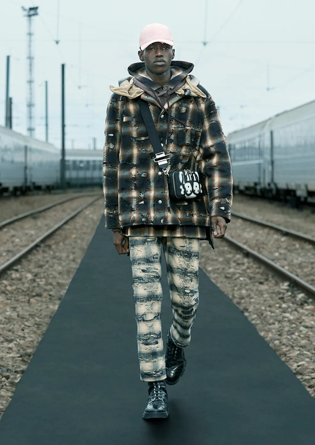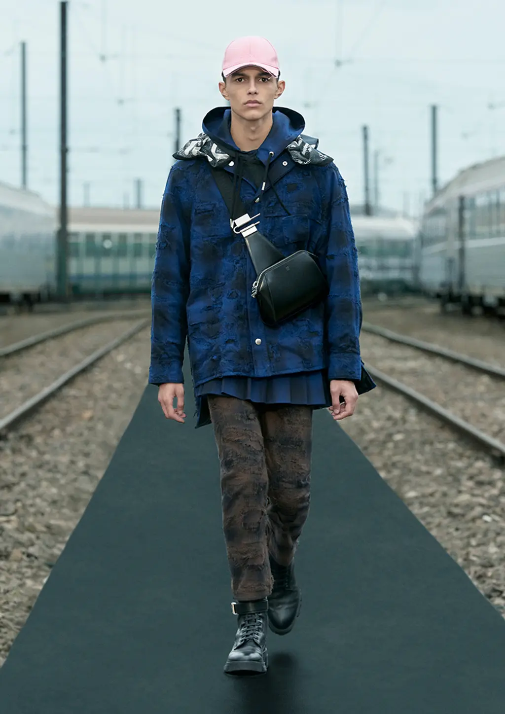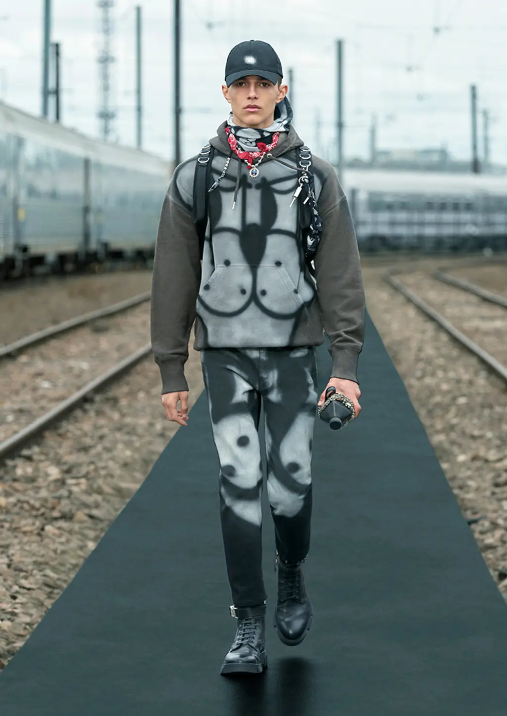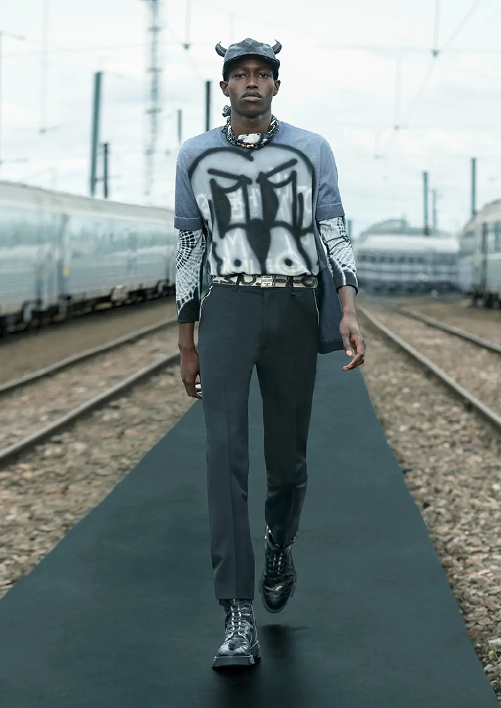 While his first full show back in March was held in the cavernous halls of the La Défense Arena, this time Williams took it to the streets, staging his runway in an eerie railway yard that appeared to pay tribute to his roots in the 1990s West Coast skate scene. Most striking were the pieces featuring airbrushed graffiti motifs, created in collaboration with the Mexican-American artist (and former Supreme collaborator) Chito, adding a playful touch to the rigorous lines and cut-away panels that served as the collection’s silhouettes.