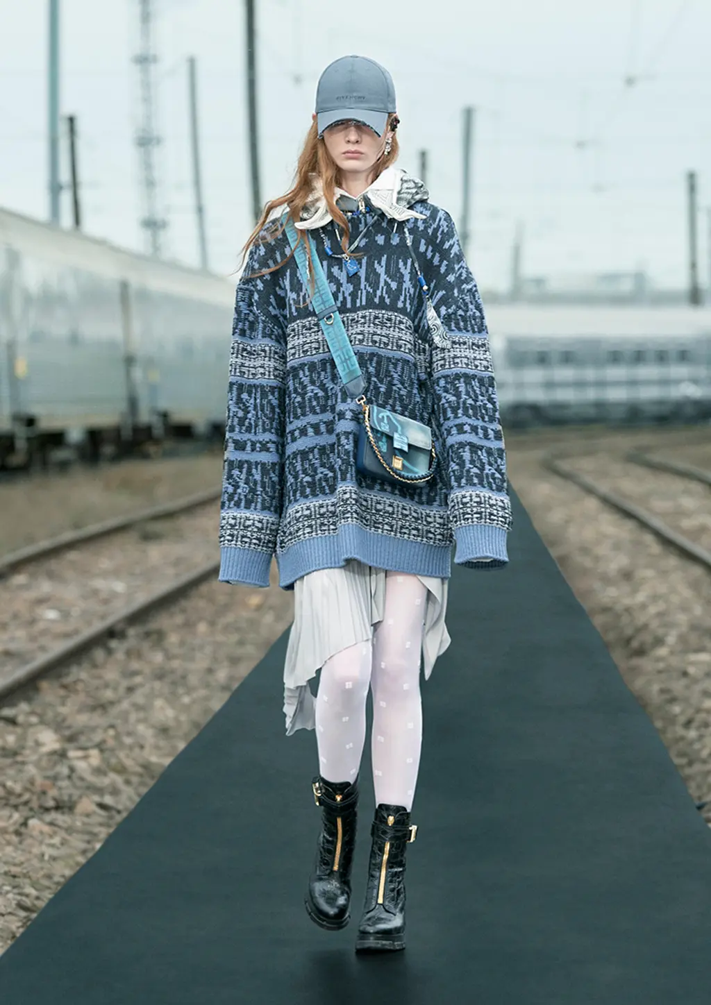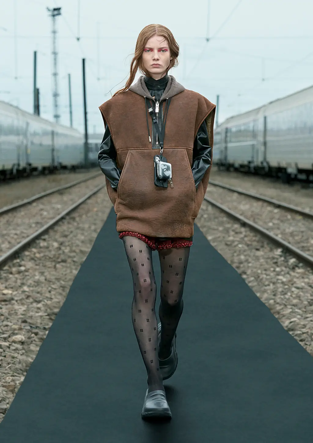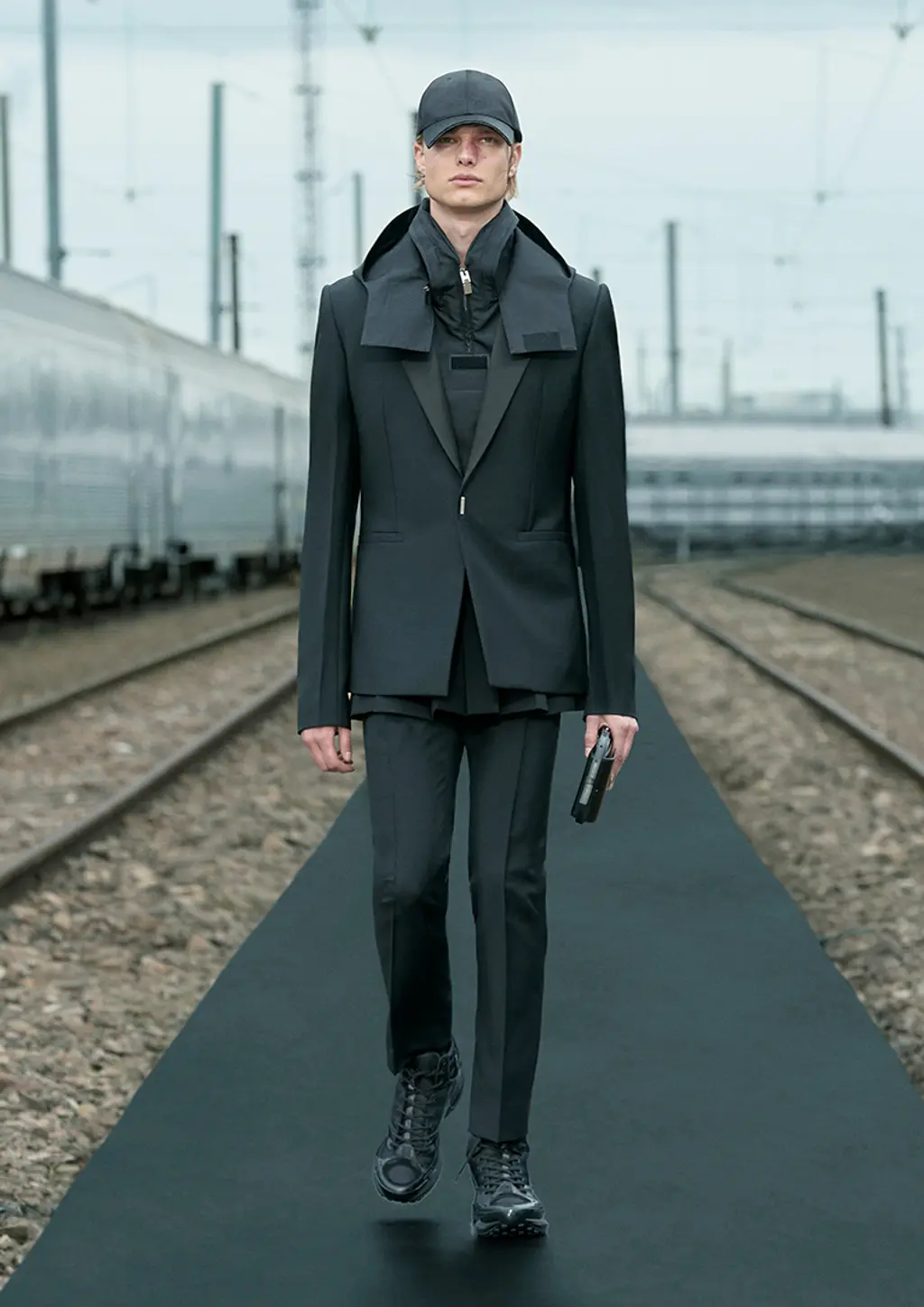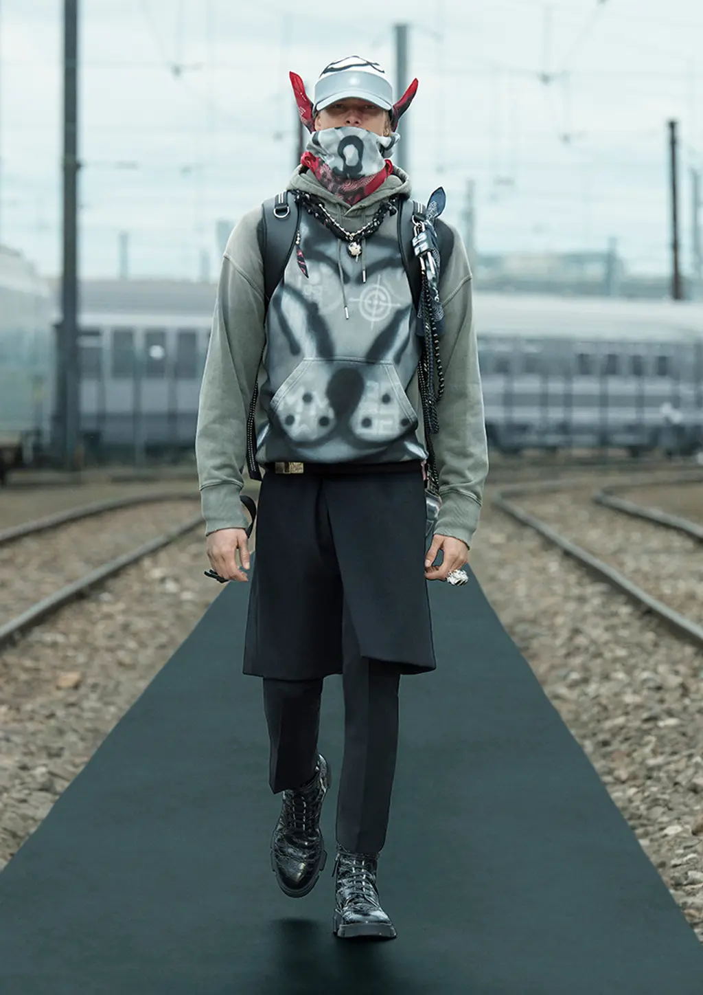 While his first full show back in March was held in the cavernous halls of the La Défense Arena, this time Williams took it to the streets, staging his runway in an eerie railway yard that appeared to pay tribute to his roots in the 1990s West Coast skate scene. Most striking were the pieces featuring airbrushed graffiti motifs, created in collaboration with the Mexican-American artist (and former Supreme collaborator) Chito, adding a playful touch to the rigorous lines and cut-away panels that served as the collection’s silhouettes.