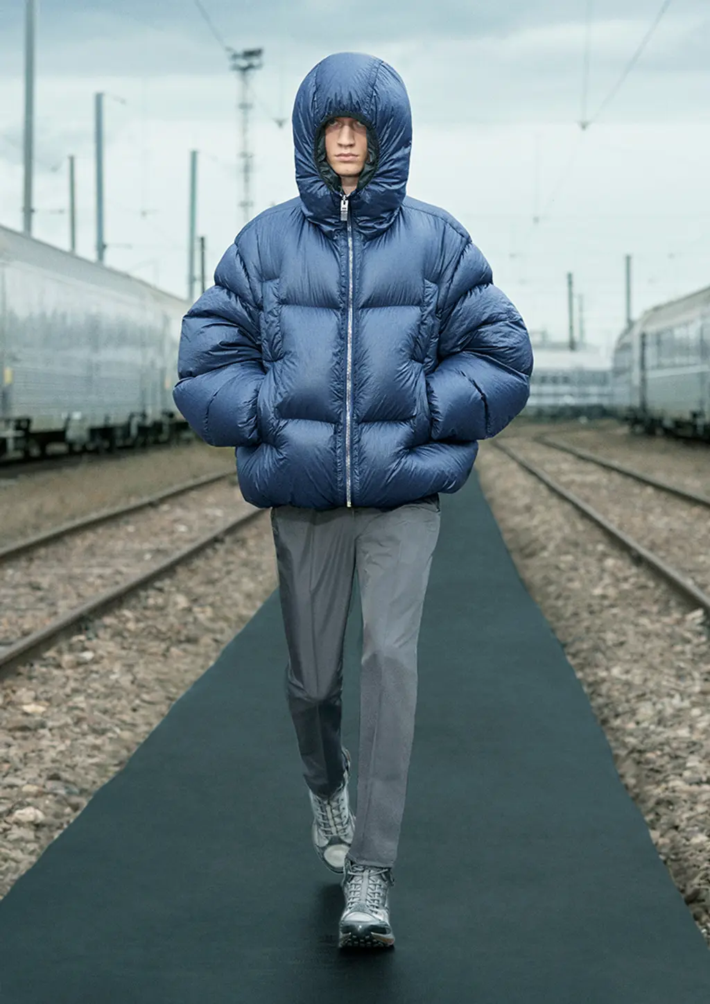 As always, the tailoring was a highlight: notably in women’s jackets that were cinched to create an almost corset-like silhouette, or sleeveless coats belted with Williams’s signature hardware details, serving as subtle nods to the sculptural forms crafted by the house’s founder. For pieces that fully displayed the technical prowess of his atelier, there were dresses crisscrossed with elaborate silver chain links and an opulent evening gown with chandelier-like beading across the skirt – worn under an oversize puffer jacket, naturally.
