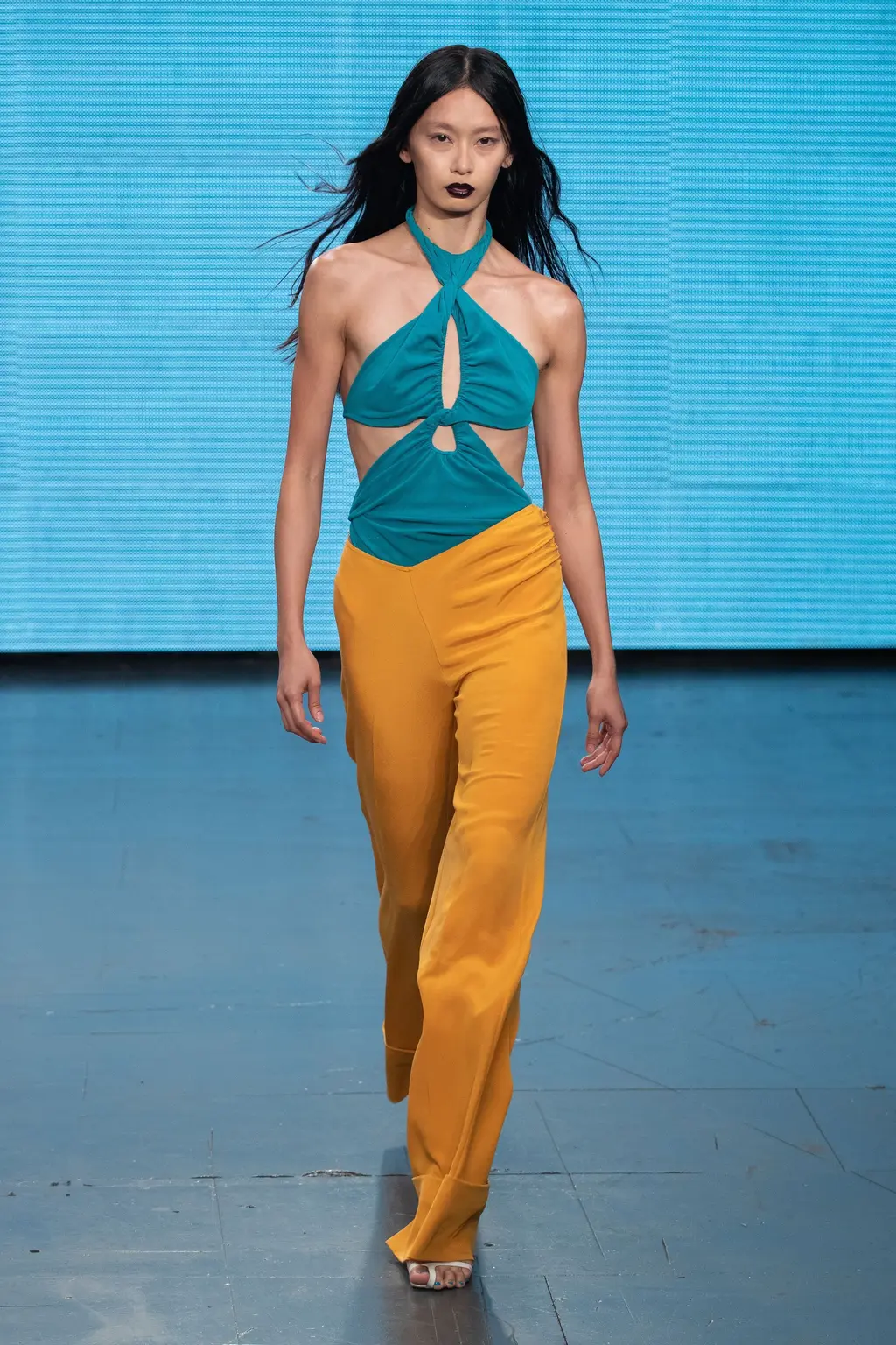 So, by extension, people must also be questioning whether they want to wear fussy bodycon dresses or their favourite pair jeans with a nice top, no? Alright, alright. We might be reading a little too much into the recent reemergence of halter neck chainmail crops. They’re probably not a visual assault on capitalism. Their return could be as simple as TikTok user @recoveredleashkid put it: “I’m very pro going-out top, so I can do a fun backless moment and still have pockets.”