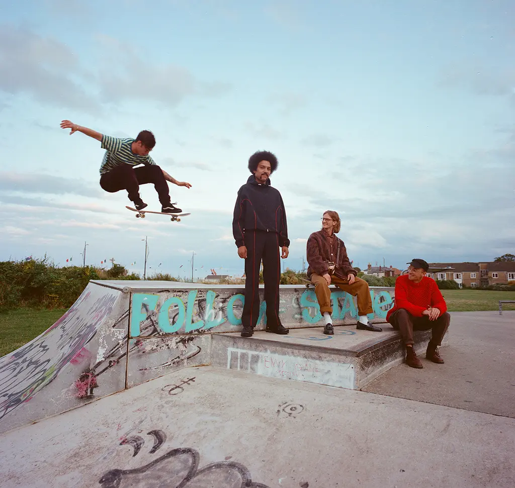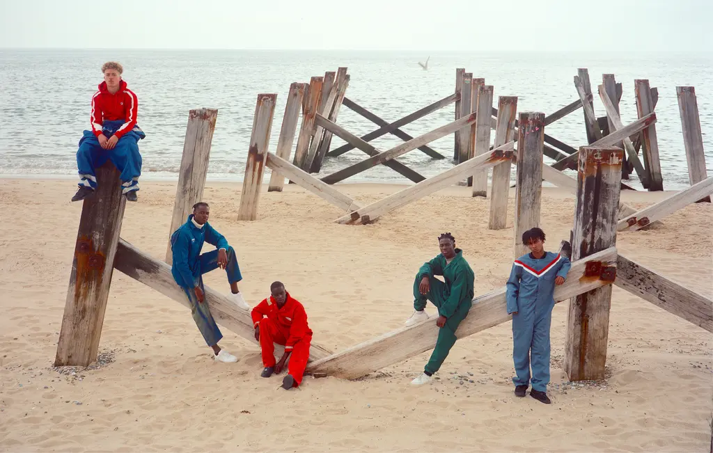 (Left to right): Tiger wears hoodie FILA F‑BOX ANNIVERSARY COLLECTION, boilersuit YARMOUTH OILSKINS ARCHIVE and shoes talent’s own. Dalino wears boilersuit courtesy of YARMOUTH OILSKINS ARCHIVE, jumper C.P. COMPANY and shoes talent’s own. Chrys wears boilersuit YARMOUTH OILSKINS ARCHIVE and shoes talent’s own. Felix wears boilersuit YARMOUTH OILSKINS ARCHIVE, jumper (worn underneath) GUESS and shoes talent’s own. Malick wears boilersuit YARMOUTH OILSKINS ARCHIVE and shoes talent’s own