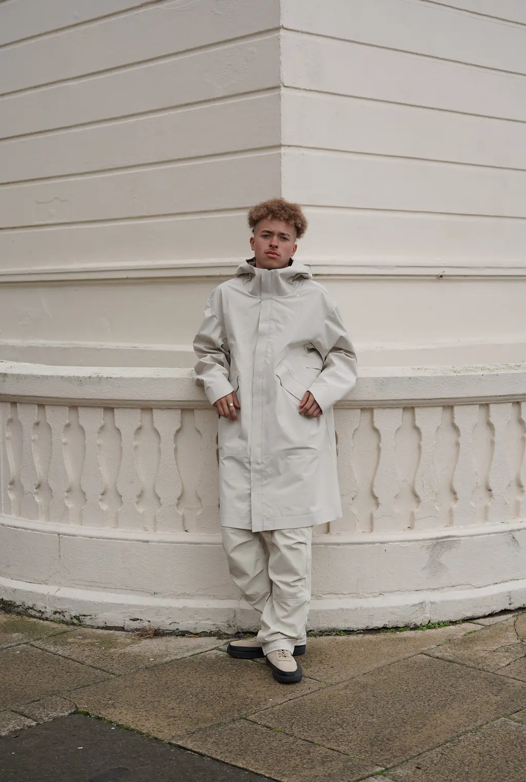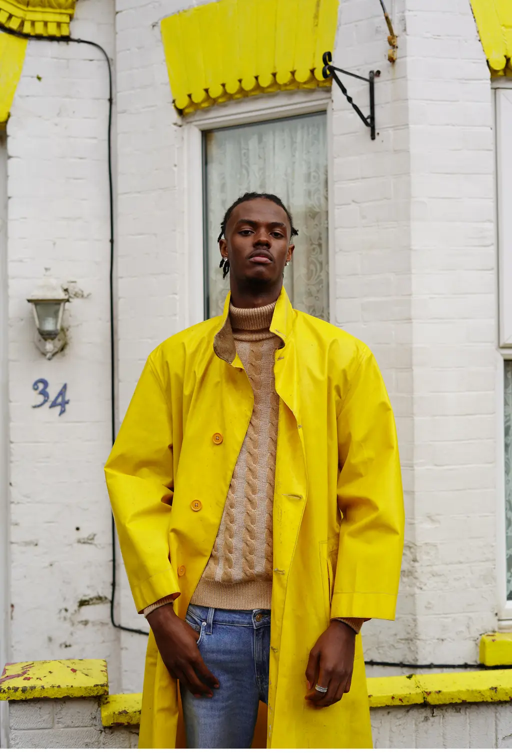 Dalino wears jacket YARMOUTH OILSKINS ARCHIVE and jumper and jeans GUESS